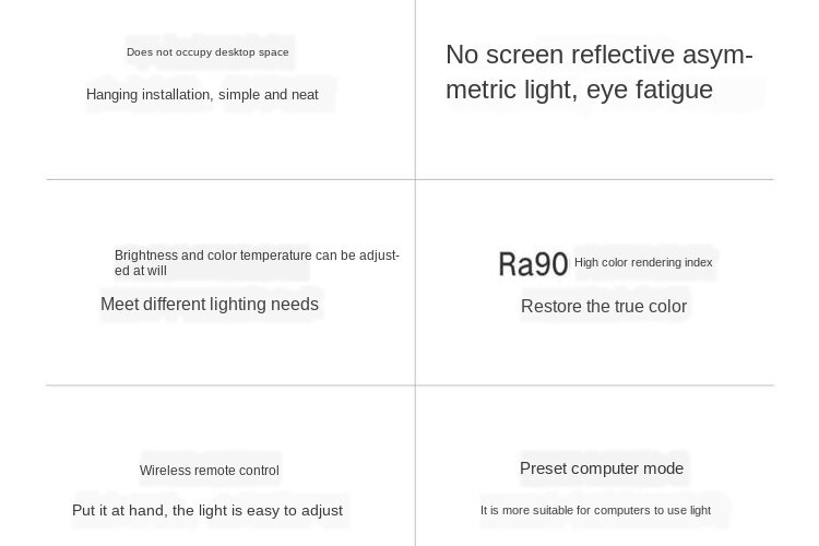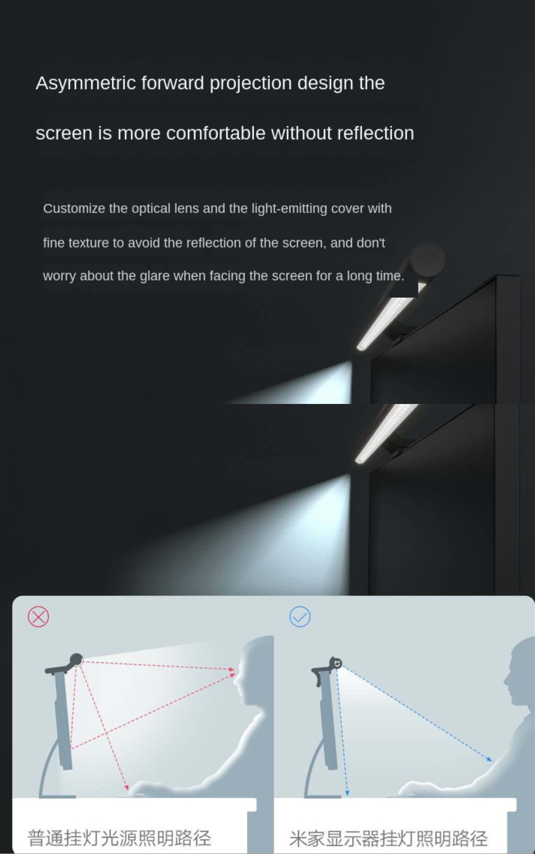 | Desain Proyeksi Maju Asimetris Lampu baca ini didesain dengan bentuk asimetris sehingga cahaya lampunya tidak kontak langsung dengan mata Anda, jadi tidak perlu khawatir desk lamp ini membuat mata sillau saat Anda membaca dan mengunakan laptop.