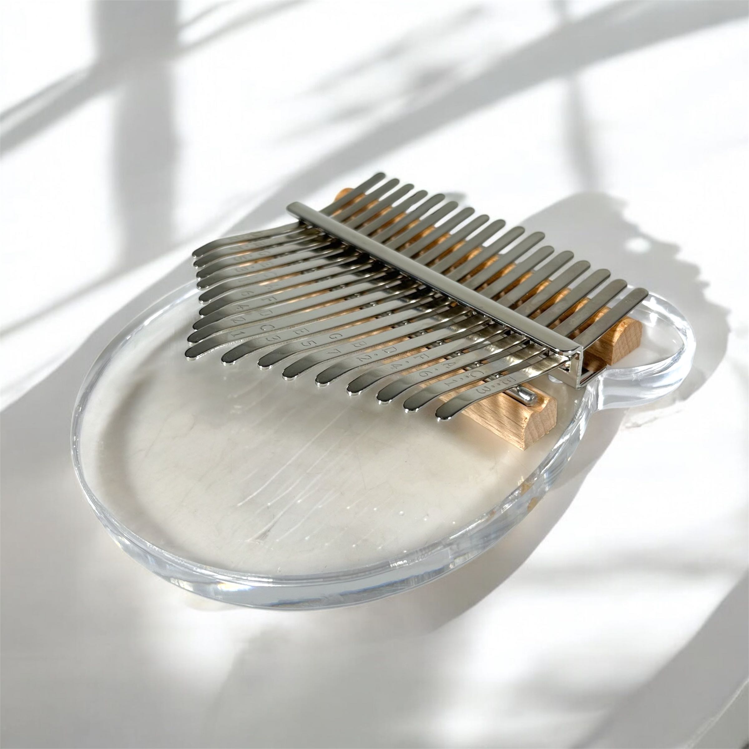 Kalimba ini dibuat dari material akrilik yang berkualitas tinggi, memberikan tampilan yang bening dan modern serta lebih tangguh terhadap perubahan suhu dan kelembapan dibandingkan material lain. String pada kalimba ini menggunakan manganese steel, logam yang dikenal kuat dan tahan lama, sehingga nada yang dihasilkan tetap stabil dan bertahan lama meskipun sering dimainkan.