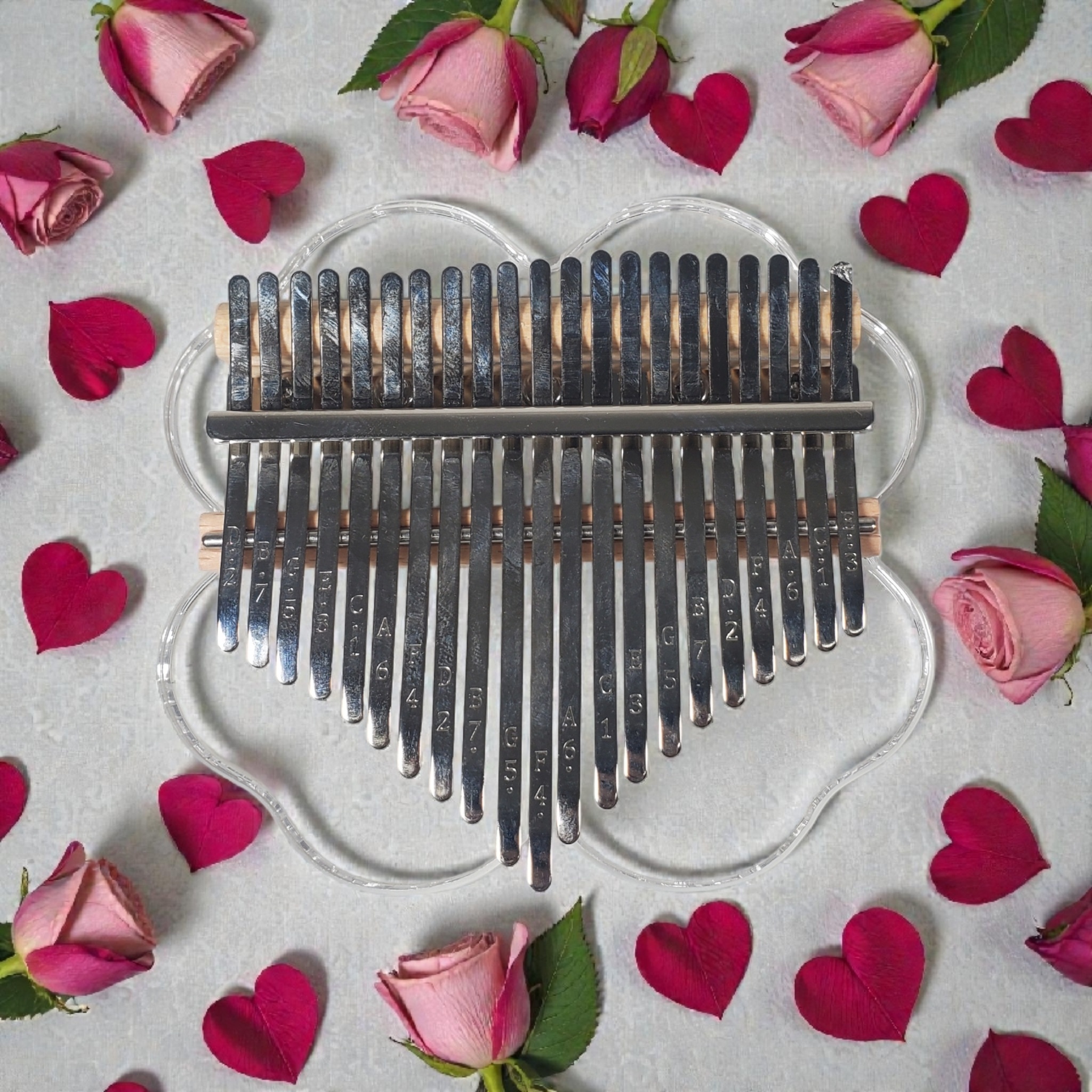 Kalimba ini dibuat dari material akrilik yang berkualitas tinggi, memberikan tampilan yang bening dan modern serta lebih tangguh terhadap perubahan suhu dan kelembapan dibandingkan material lain. String pada kalimba ini menggunakan manganese steel, logam yang dikenal kuat dan tahan lama, sehingga nada yang dihasilkan tetap stabil dan bertahan lama meskipun sering dimainkan.