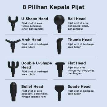 | 8 Pilihan Kepala Pijat Jangkau berbagai area tubuh dengan maksimal dengan 8 pilihan kepala pijat. Mulai dari ball head hingga thumb head, pilih kepala pijat yang paling sesuai untuk berbagai kebutuhan. |