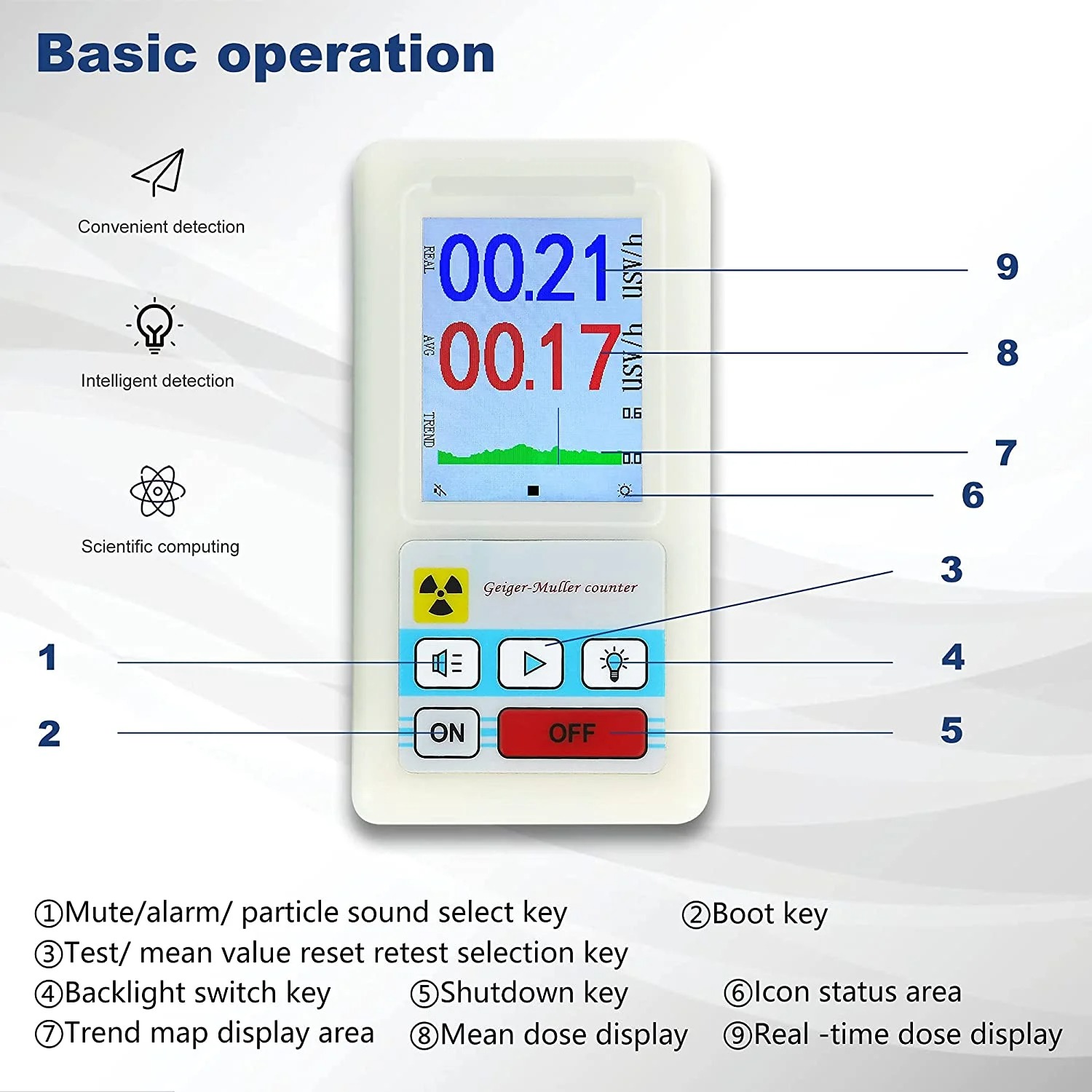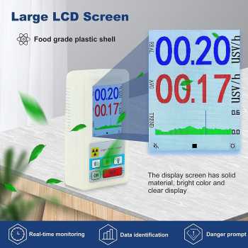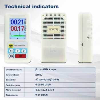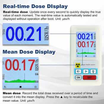 | Rentang Pengukuran Luas Geiger counter ini memiliki rentang pengukuran yang luas untuk dosis radiasi, memungkinkan pemantauan dari tingkat radiasi rendah hingga tinggi dengan tingkat ketelitian yang baik. Tampilan nilai real-time dan nilai rata-rata (mean dose) membantu Anda memahami kondisi paparan secara menyeluruh, baik untuk penggunaan sesaat maupun pemantauan jangka waktu tertentu. |
