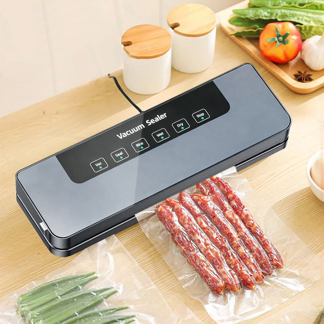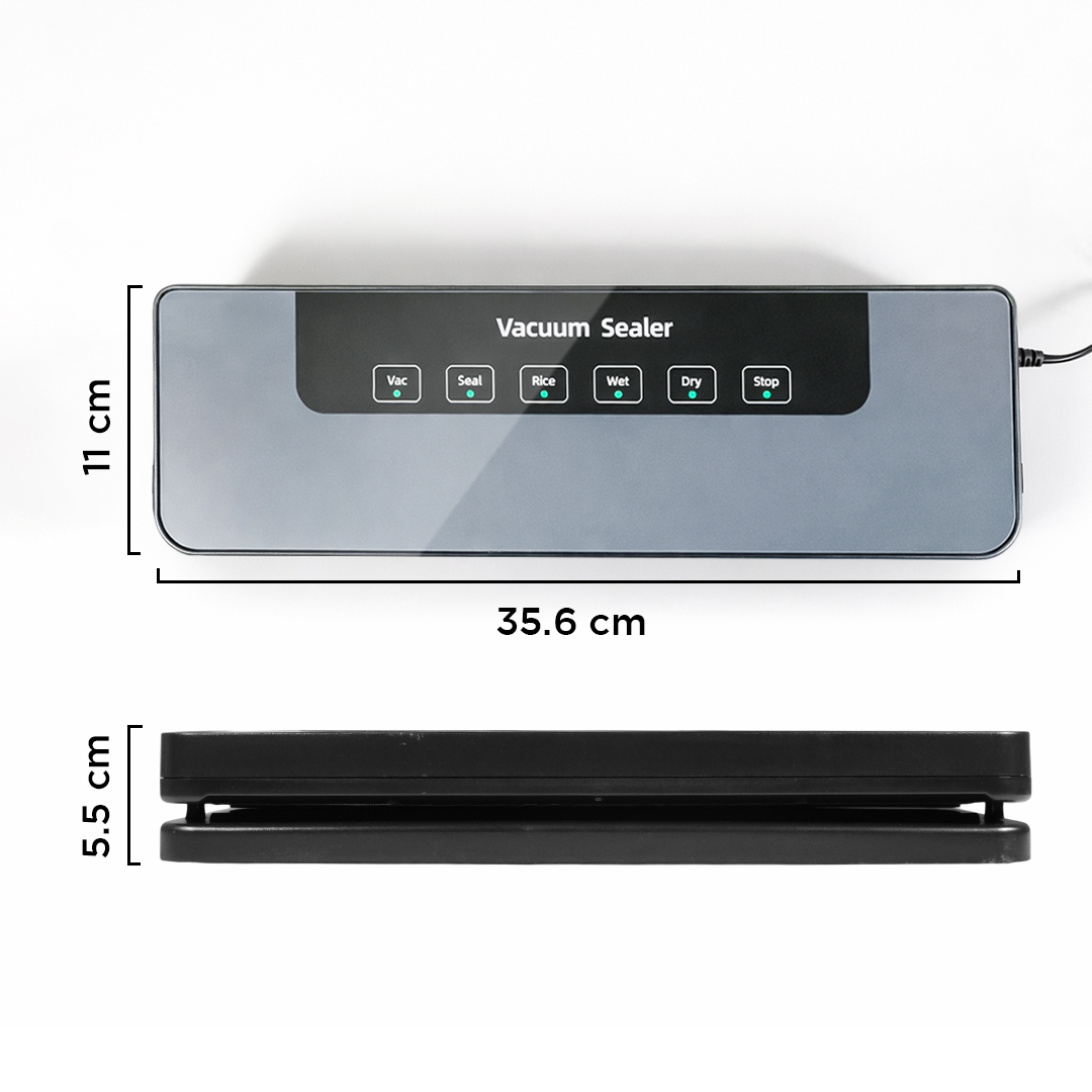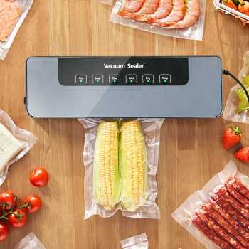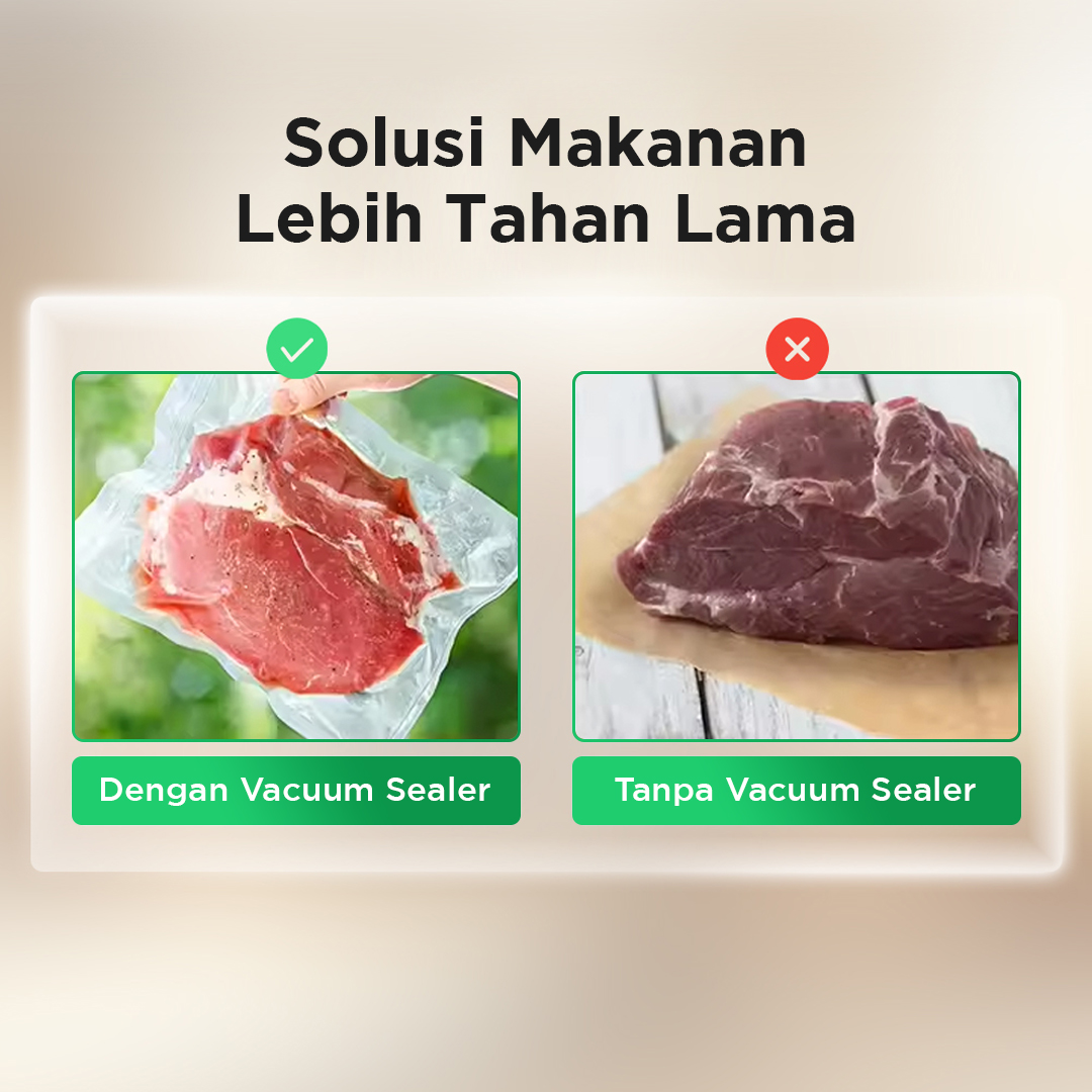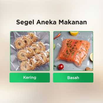 | Solusi Makanan Lebih Tahan Lama Makanan lebih tahan lama dan tidak mudah rusak berkat sistem penyimpanan kedap udara. Vacuum sealer akan menyedot udara di dalam keamasan yang efektif mencegah pembusukan. |