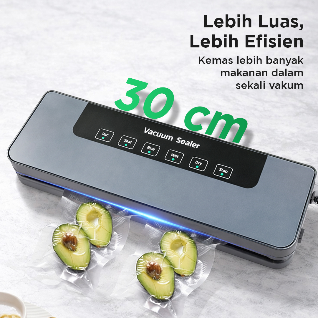 | Lebih Luas, Lebih Efisien Area sealer dengan lebar 30 cm membuat Anda dapat mengemas lebih banyak makanan dalam sekali vakum. Cocok untuk penggunaan sehari-hari hingga bisnis kecil. |