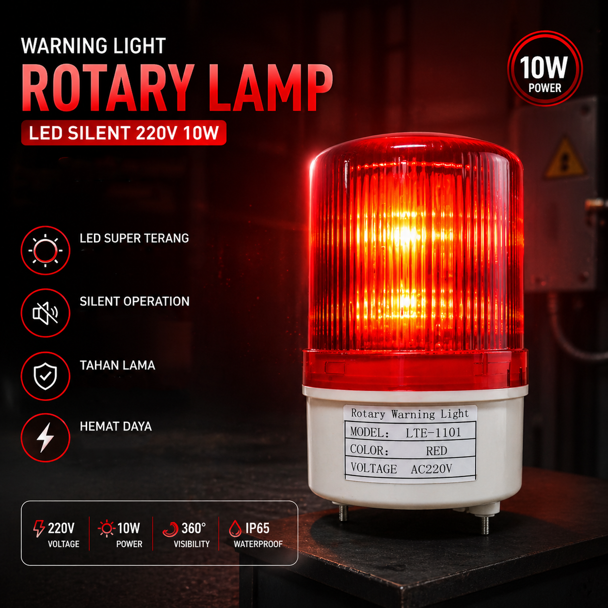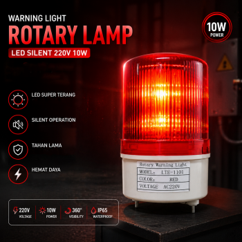 Warning light dilengkapi dengan rotary lamp yang berputar 360°, menghasilkan cahaya merah yang terang dan mencolok dari segala arah. Teknologi LED memberikan intensitas cahaya tinggi dengan konsumsi daya rendah, menjadikannya lebih efisien dan tahan lama dibandingkan lampu konvensional. Ideal untuk memberi tanda bahaya, peringatan mesin, alarm pintu, atau sinyal darurat di area kerja.