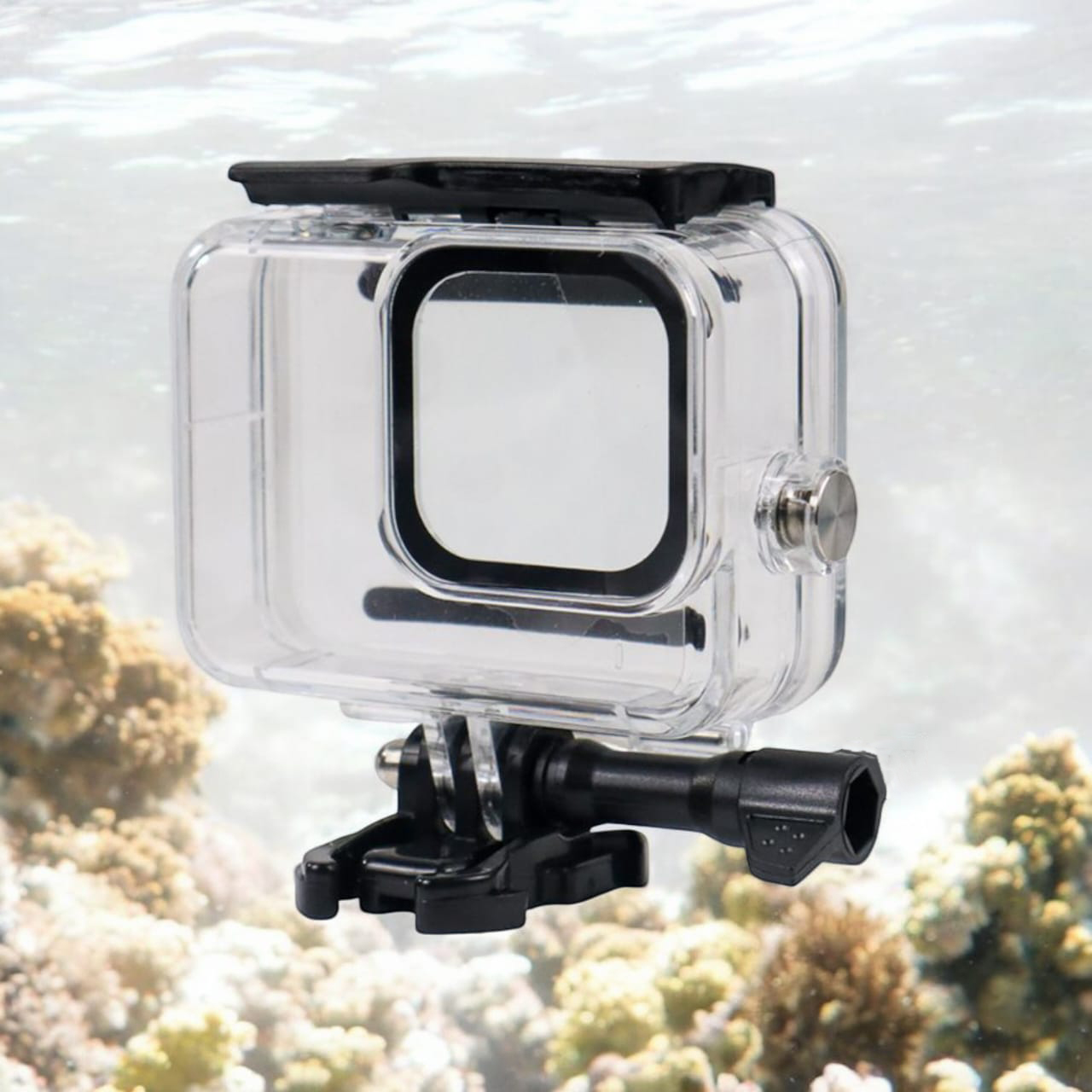 | Tahan Air Hingga 60 M Bawah Air Dengan casing ini, Anda dapat membawa GoPro Hero 8 menjelajah ke dalam laut, baik untuk aktivitas diving maupun snorkeling. Dirancang untuk tahan air hingga kedalaman 60 M, alat ini memberikan kebebasan penuh untuk merekam aksi Anda di dunia bawah laut. |