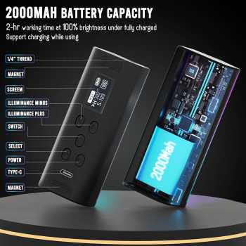 | Baterai Tahan Lama Menggunakan baterai bawaan berkapasitas 2000 mAh dengan durasi penggunaan 2 jam untuk penggunaan cahaya yang paling terang secara non-stop. Jika daya baterai habis, Anda bisa mengisi ulang lampu fill light menggunakan kabel daya Type C yang tersedia. |