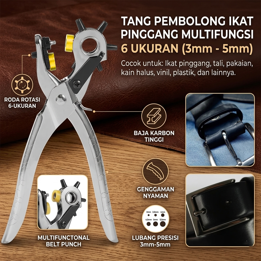 | 6 Pilihan Ukuran Lubang (3–5 mm) Tang pembolong ini dilengkapi 6 mata punch berbeda dengan ukuran lubang mulai dari 3 hingga 5 mm. Anda dapat memilih ukuran lubang sesuai kebutuhan tanpa harus mengganti alat. Sangat praktis untuk berbagai jenis ikat pinggang dan bahan. |