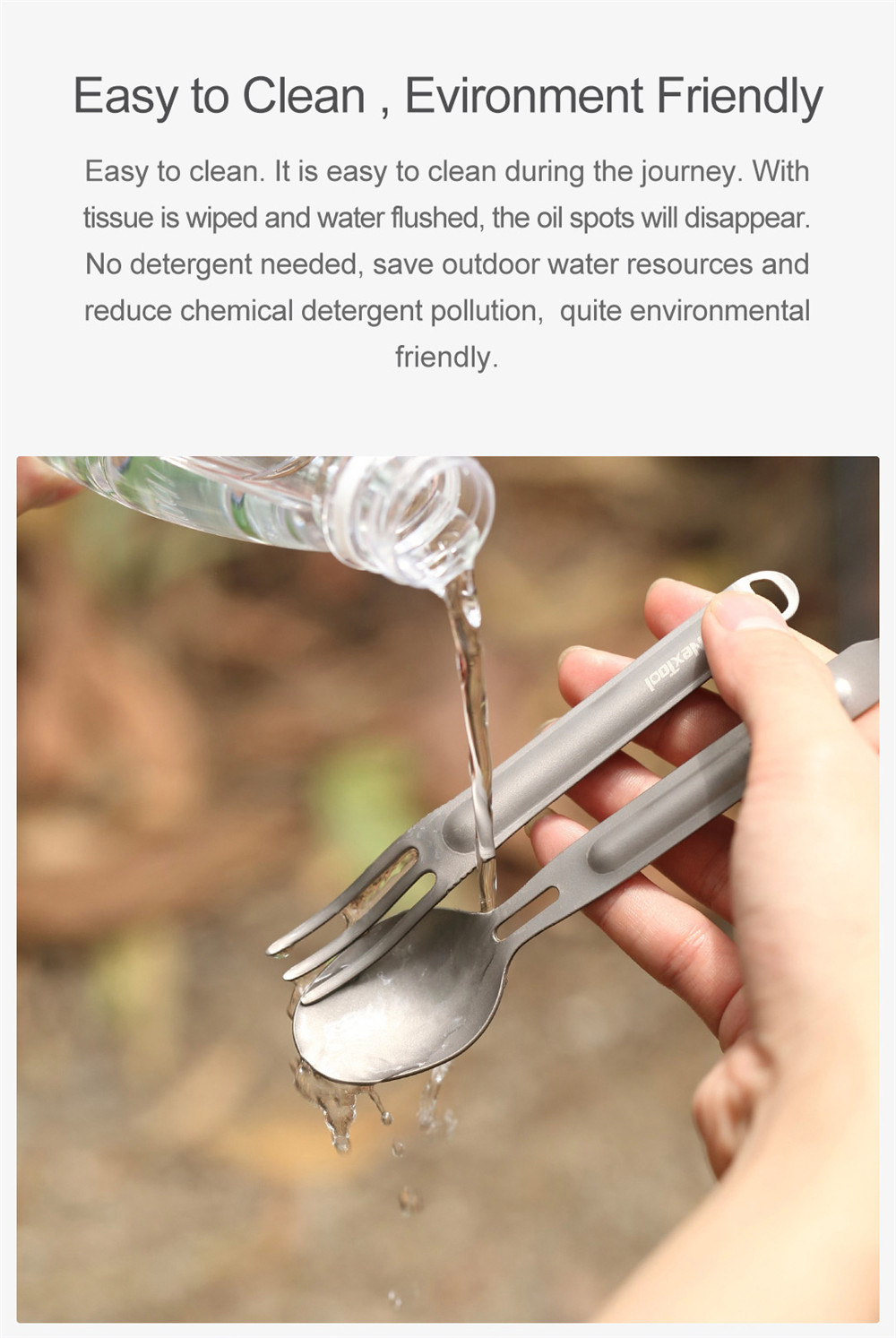 | Mudah Digunakan dan Ramah Lingkungan Kebiasaan membawa sendok plastik saat berkemah atau piknik adalah salah satu hal yang dapat mencemari lingkungan karena sampahnya sulit diurai. Kini, Anda bisa berkontribusi untuk menjaga alam dan lingkungan dengan menggunakan alat makan dari NexTool. Alat makan ini mudah dibersihkan meskipun hanya menggunakan air sekalipun.