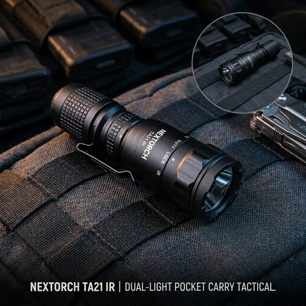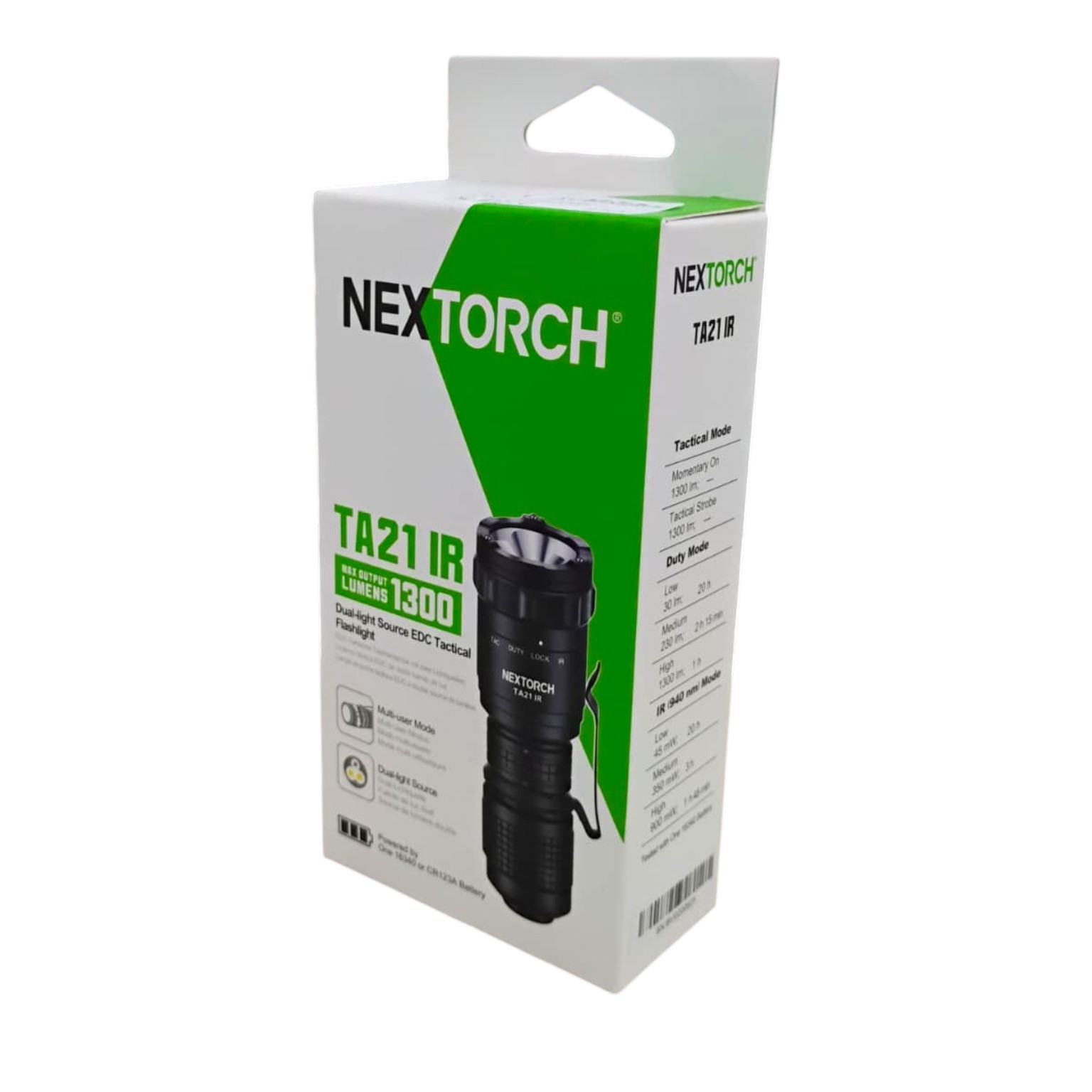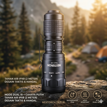 NEXTORCH TA21 IR adalah senter tactical dual light dengan cahaya putih hingga 1300 Lumens dan infrared 940 nm untuk kebutuhan outdoor, patroli, dan penggunaan profesional. Memiliki jangkauan hingga 160 M, mode tactical & duty, serta baterai USB Type-C rechargeable. Bodinya compact, kuat, IPX8 waterproof, dan tahan benturan hingga 2 M.