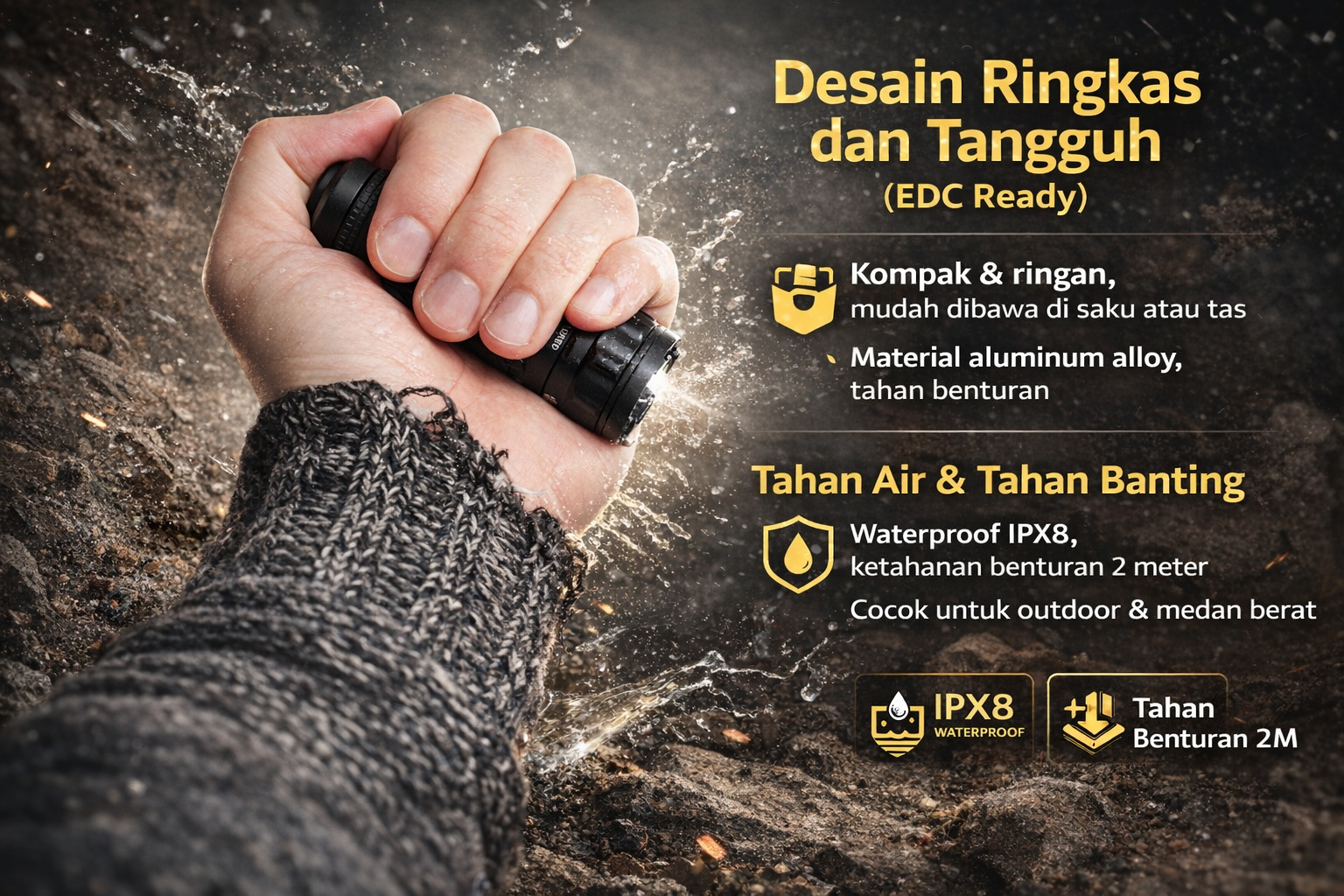| Tahan Air dan Tahan Banting Dengan sertifikasi IPX8 waterproof, senter ini aman digunakan dalam kondisi hujan bahkan terendam air. Ketahanan benturan hingga 2 M memastikan durability saat digunakan di medan berat. Sangat cocok untuk aktivitas outdoor ekstrem dan kondisi kerja lapangan. |