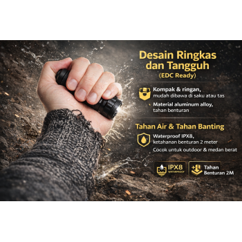| Desain Ringkas dan Tangguh (EDC Ready) Desain compact membuat senter mudah dibawa di saku atau tas tanpa terasa bulky. Material aluminum alloy memberikan kekuatan ekstra terhadap benturan dan penggunaan berat. Cocok untuk penggunaan harian maupun kebutuhan profesional. |