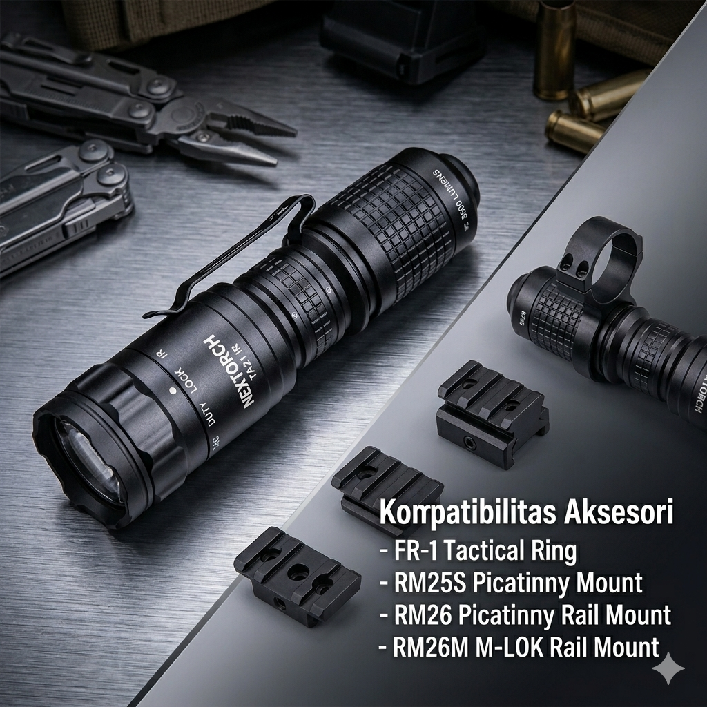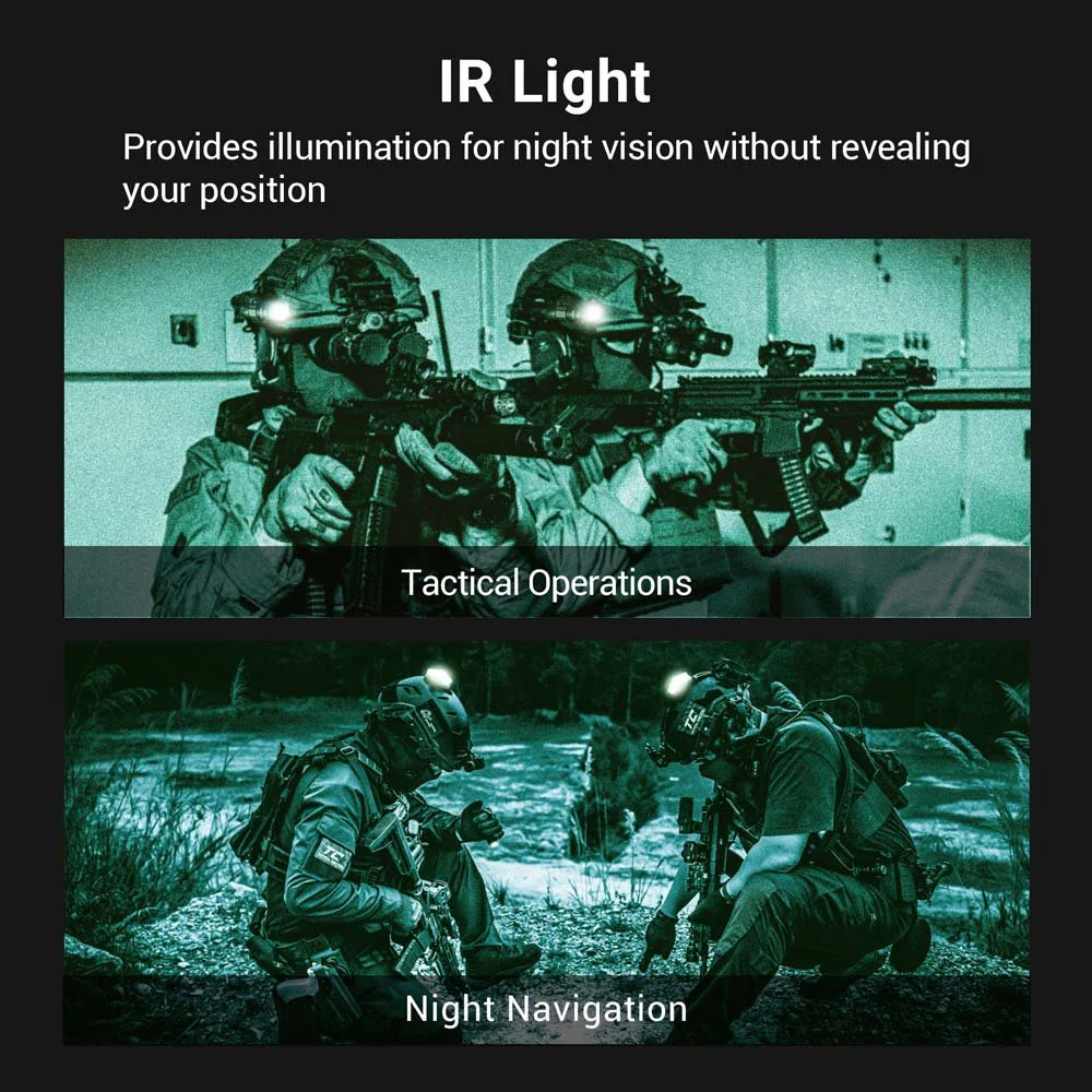 | Dual Light (White & Infrared 940 nm) Senter ini memiliki dua jenis pencahayaan, cahaya putih untuk penggunaan umum dan infrared 940 nm untuk kebutuhan taktis atau penggunaan dengan night vision. Fitur ini sangat berguna untuk situasi stealth atau operasi khusus tanpa menarik perhatian. Dengan kombinasi ini, pengguna mendapatkan fleksibilitas maksimal dalam satu perangkat tanpa perlu membawa alat tambahan. |