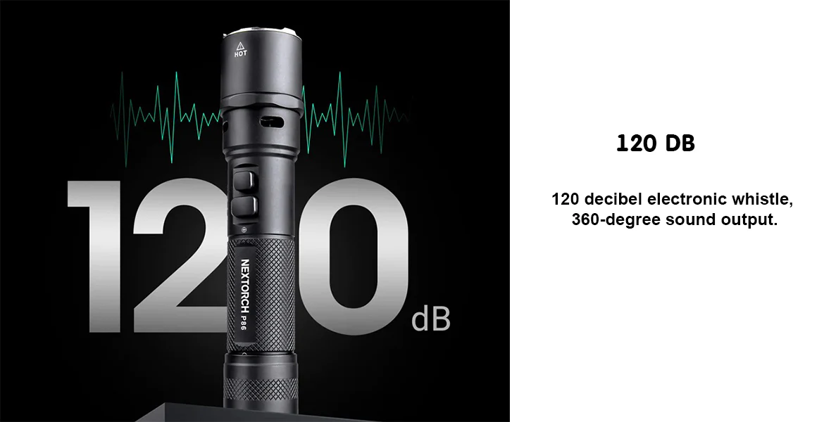 | Peluit Elektronik 120 dB untuk Sinyal Darurat Salah satu keunggulan utama NEXTORCH P86 adalah adanya electronic whistle 120 dB yang sangat berguna saat kondisi darurat. Suara keras yang dihasilkan membantu pengguna memberi tanda bahaya, meminta bantuan, atau menarik perhatian orang di sekitar. Fitur ini membuat senter tidak hanya berfungsi sebagai alat penerangan, tetapi juga sebagai perlengkapan emergency yang lebih siap pakai. |