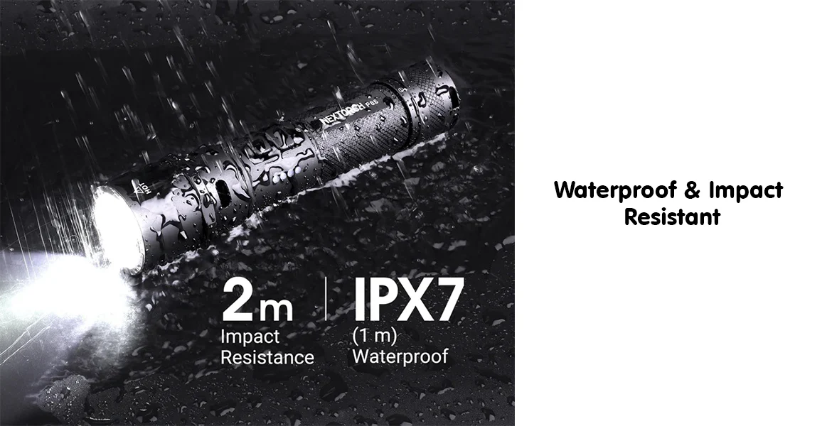 | Tahan Air IPX7 dan Tahan Benturan hingga 2 M NEXTORCH P86 memiliki rating IPX7 yang membuatnya tahan terhadap cipratan air dan penggunaan pada kondisi basah tertentu. Produk ini juga memiliki ketahanan benturan hingga 2 M, sehingga lebih siap untuk penggunaan lapangan yang aktif. Kombinasi ini memberi rasa aman lebih saat senter dibawa untuk aktivitas luar ruangan atau sebagai perlengkapan darurat. |