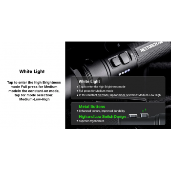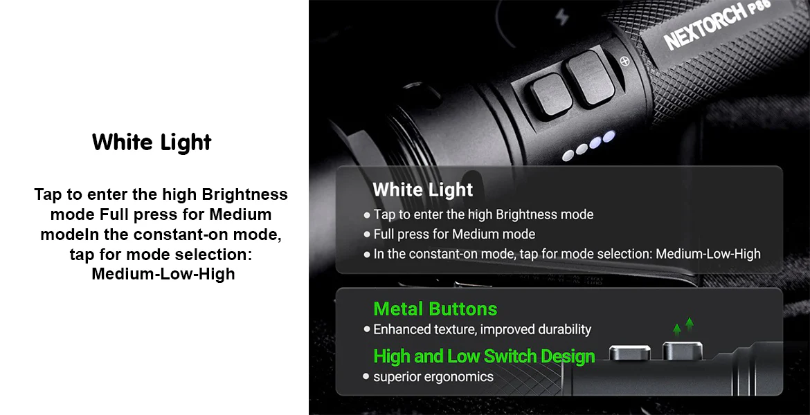 | Beberapa Mode Cahaya untuk Berbagai Situasi NEXTORCH P86 memiliki beberapa pilihan mode cahaya seperti momentary on, high, medium, dan low yang bisa disesuaikan dengan kebutuhan. Mode terang cocok untuk penerangan maksimal, sedangkan mode hemat daya ideal untuk penggunaan lebih lama. Fleksibilitas ini membantu pengguna menyesuaikan intensitas cahaya dengan kondisi lapangan, efisiensi baterai, dan kebutuhan pencahayaan yang berbeda. |