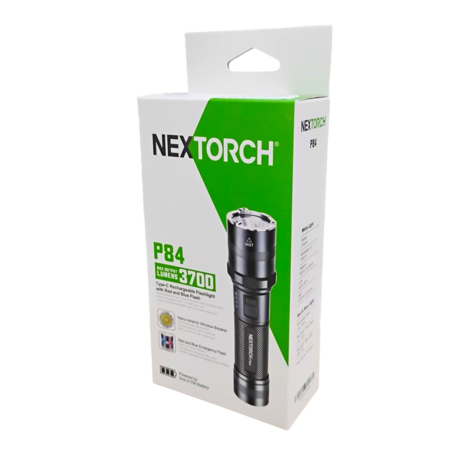 NEXTORCH P84 adalah senter tactical berdaya tinggi dengan output hingga 3700 Lumens dan jarak sorot sampai 370 M. Dilengkapi lampu merah biru, mode strobe, baterai 21700 4800 mAh, serta pengisian USB Type-C. Cocok untuk patroli, security, outdoor, inspeksi, dan kondisi darurat dengan bodi kokoh aluminum alloy berstandar IPX7.