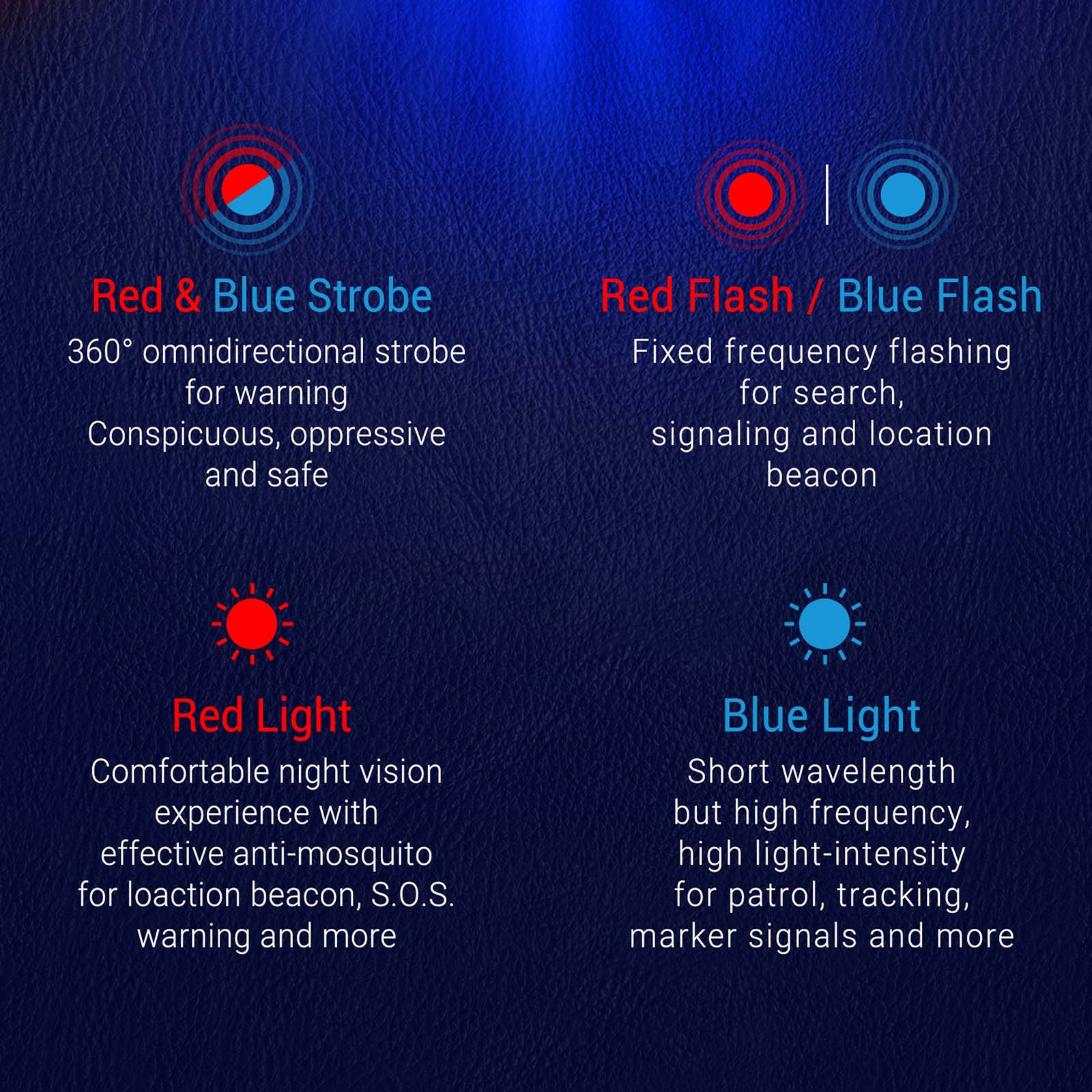 | Dilengkapi Lampu Merah dan Biru untuk Sinyal Darurat Selain lampu utama putih, NEXTORCH P84 juga dibekali mode red & blue flash, red flash, blue flash, red light, dan blue light. Fitur ini berguna sebagai penanda visual, sinyal darurat, pengamanan area, hingga kebutuhan operasional tertentu di lapangan. Kehadiran lampu sinyal membuat senter ini lebih multifungsi dibanding senter biasa. |