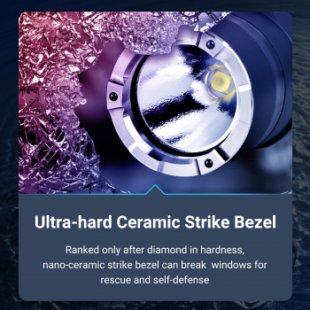 | Ceramic Strike Bezel untuk Proteksi Tambahan Pada bagian kepala senter terdapat ceramic strike bezel yang menambah karakter tactical dan fungsi utilitas produk. Komponen ini berguna sebagai elemen proteksi tambahan dalam situasi darurat atau kebutuhan khusus di lapangan. Desain ini juga membuat tampilan senter terlihat lebih profesional, kokoh, dan siap untuk penggunaan berat. |