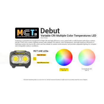 | Pencahayaan Lebih Akurat & Adaptif Dibekali teknologi MCT UHE LED (Multiple Color Temperatures) yang mengombinasikan high-CRI core dan high-efficiency core dalam satu sistem pencahayaan, sehingga mampu menghadirkan cahaya dengan akurasi warna tinggi (CRI ≥ 90), tampilan warna lebih natural, serta detail objek yang terlihat jelas dan nyata. Fitur multi suhu warna ini membuat pencahayaan lebih adaptif di berbagai kondisi, nyaman di mata untuk penggunaan jangka panjang, sekaligus tetap efisien dalam konsumsi daya, menjadikannya ideal untuk aktivitas outdoor, trail running, hiking, maupun kebutuhan teknis yang menuntut visibilitas dan ketepatan warna. |