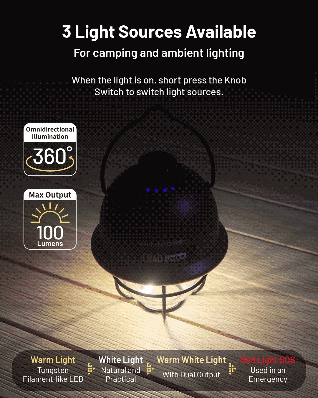 | 4 Mode Multifungsi 3 Sumber lampu LED mampu berikan Anda pencahayaan hingga 100 lumens dengan 4 mode cahaya. Mode warm light dapat digunakan sebagai lampu tidur di dalam tenda. Sementara, mode white light dan warm white light dapat digunakan untuk penjelajahan alam. Serta dilengkapi dengan mode red light SOS yang dapat diaktifkan ketika Anda berada di tengah kondisi darurat.