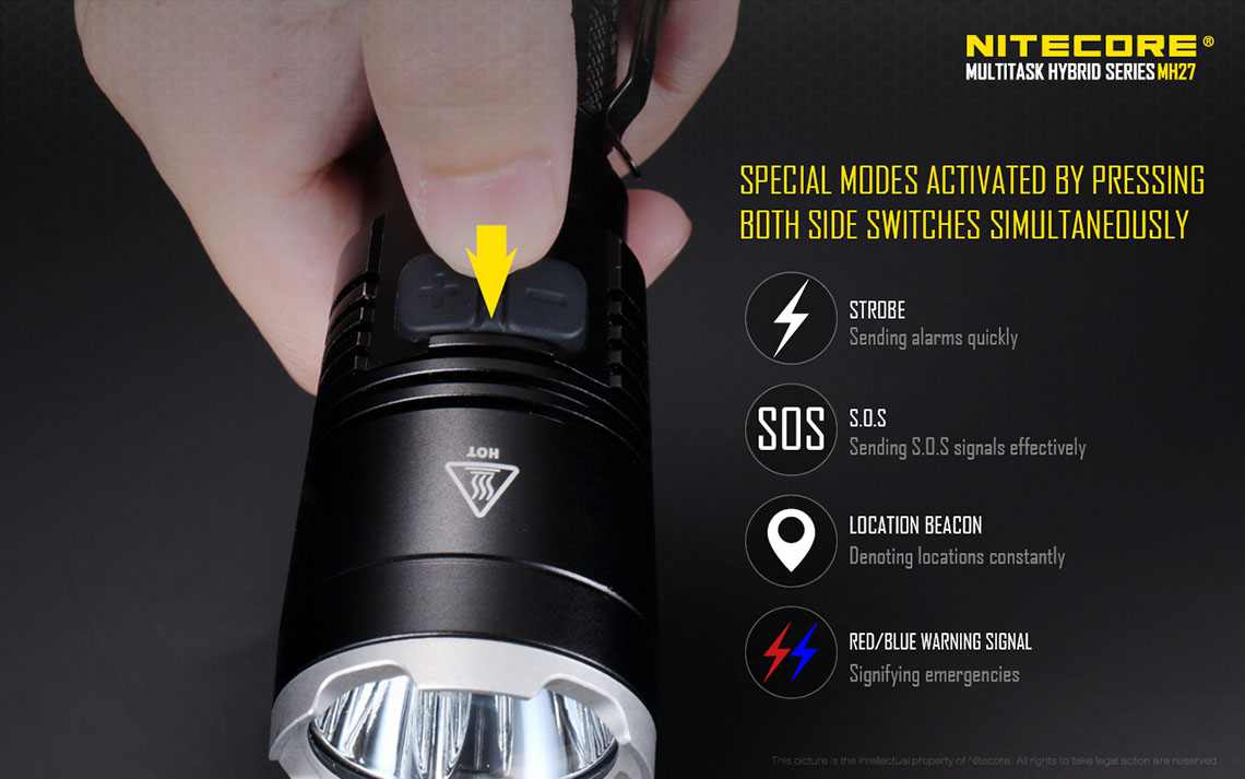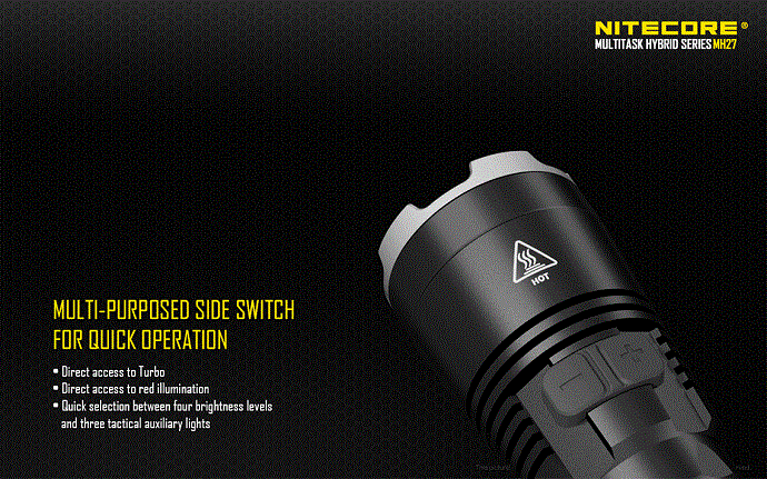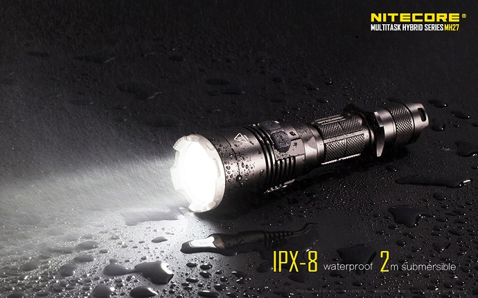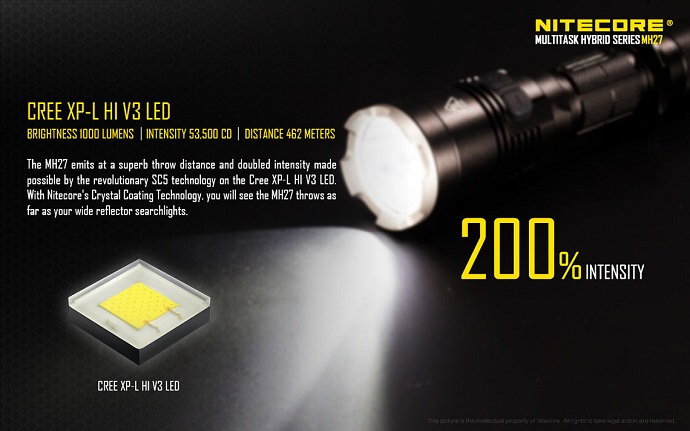 Senter Nitecore MH27 merupakan senter LED untuk berbagai macam kebutuhan yang menggunakan CREE XP-L HI V3 sehingga mampu menghasilkan cahaya 1000 lumens. Senter ini juga dibekali 3 buah LED RGB yang bisa menghasilkan warna cahaya merah hijau dan biru, warna lampu RGB tersebut bisa digunakan untuk keadaan darurat.