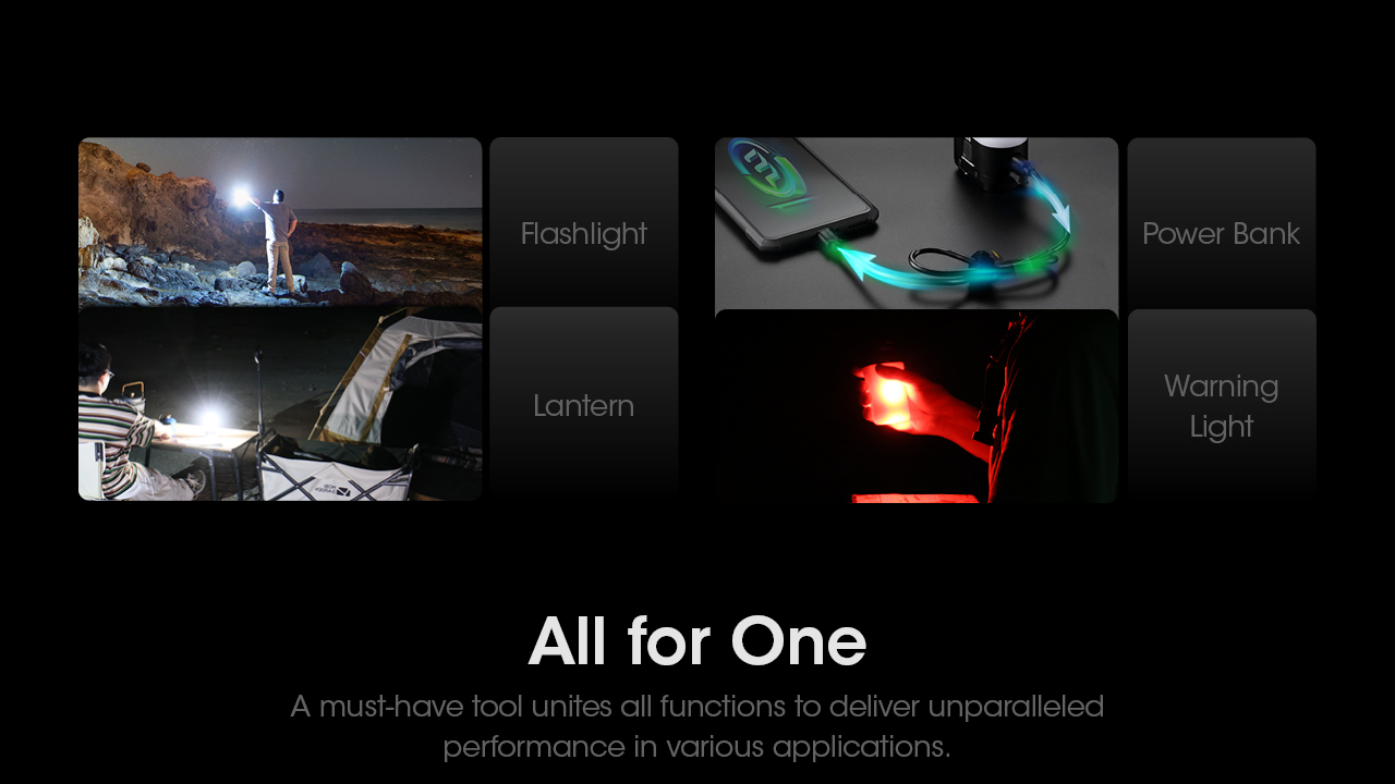 | Mode Sesuaikan Kebutuhan Untuk mendukung berbagai skenario dan kondisi penggunaan, senter LED ini dibekali pengaturan tingkat kecerahan pada mode senter dan lentera. Anda bahkan bisa menggunakan mode spesial lainnya, seperti red beacon dan redSOS untuk situasi darurat. |