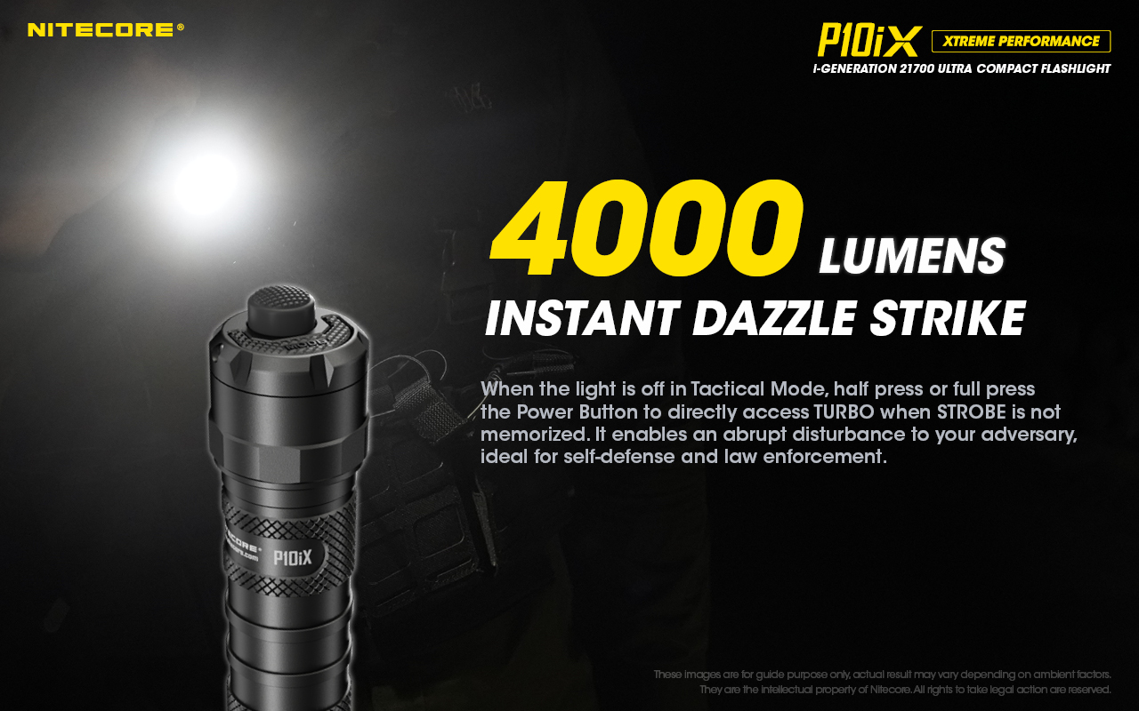 | CREE XP-L2 V6 NITECORE P10iX menggunakan empat buah LED CREE XP-L2 V6 yang menghasilkan cahaya sebesar 4000 lumens, dengan jarak tembak hingga 158 M dan intensitas pencahayaan hingga 6250 cd. Dengan spesifikasi tersebut, senter ini cocok digunakan untuk berbagai macam keperluan mulai dari kegiatan sehari-hari hingga untuk pertahanan diri.