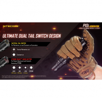| Desain Tombol Ekor Ganda Senter LED P10i memang hadir untuk menunjang keperluan profesional. Hal ini tampak pada desain tombol dua ekor untuk efisiensi penggunaan. Desain tombol tactical yang menonjol akan mempermudah Anda mengaksesnya. Sementara tombol strobe dirancang dengan desain inset pedal agar lebih terlindungi. |