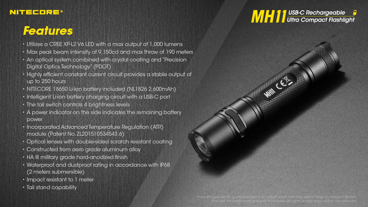 Senter NITECORE MH11 dirancang khusus untuk kebutuhan militer, keamanan, penjelajahan alam, dan kegiatan di luar ruangan lainnya. Dengan LED CREE XP-L2, senter mampu memberikan cahaya terang hingga 1000 Lumens. Dilengkapi dengan kecanggihan fungsi memori dan baterai yang tahan lama. Senter juga tidak mudah rusak meski terkena air ataupun terjatuh dari ketinggian 1 M.