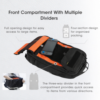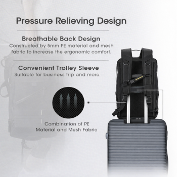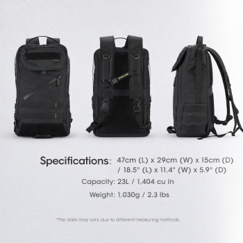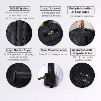 | Desain Tambahan Ergonomis Tas ransel juga dilengkapi dengan Frontal MOLLE System dan loop surface. Desain ini memungkinkan ekspansi modular yang ideal untuk aktivitas outdoor, kerja lapangan, atau perjalanan jarak jauh. Dilengkapi juga dengan trolley sleeve di bagian belakang memungkinkan tas ini diselipkan di gagang koper, memberikan kenyamanan ekstra saat di bandara atau stasiun. |