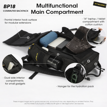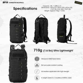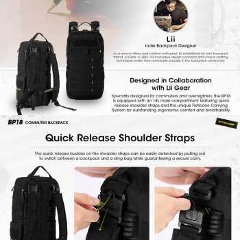 NITECORE BP18 adalah tas ransel tactical 18L dengan MOLLE system berbahan 500D nylon water resistant yang kuat namun ringan (± 710 g). Dilengkapi kompartemen laptop 14 inch berlapis bantalan, sistem Fishbone ergonomic support untuk kenyamanan maksimal, serta quick release strap yang bisa diubah dari backpack ke sling bag, cocok sebagai tas kerja pria, tas EDC, dan tas laptop tactical premium.