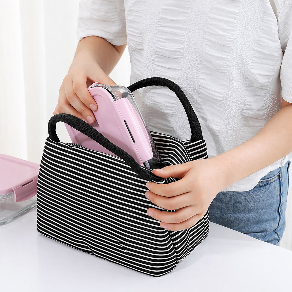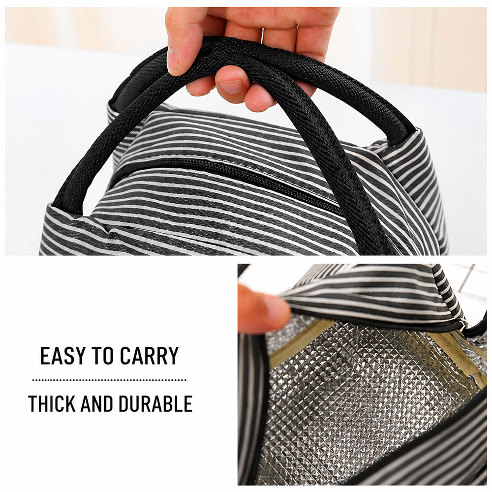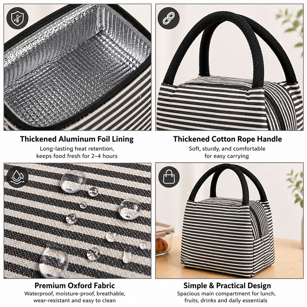 Tas bekal insulated sebagai solusi praktis sekaligus stylish menjaga suhu makanan Anda tetap ideal dari rumah hingga meja kerja, ruang kelas, atau area piknik. Dengan desain tote bag bergaris hitam putih yang timeless dan elegan, tas bekal ini cocok dipadukan dengan berbagai gaya busana sehari-hari. Dibuat dari bahan oxford cloth berkualitas dengan lapisan insulasi termal di dalamnya, insulated lunch bag ini siap menemani aktivitas harian Anda.