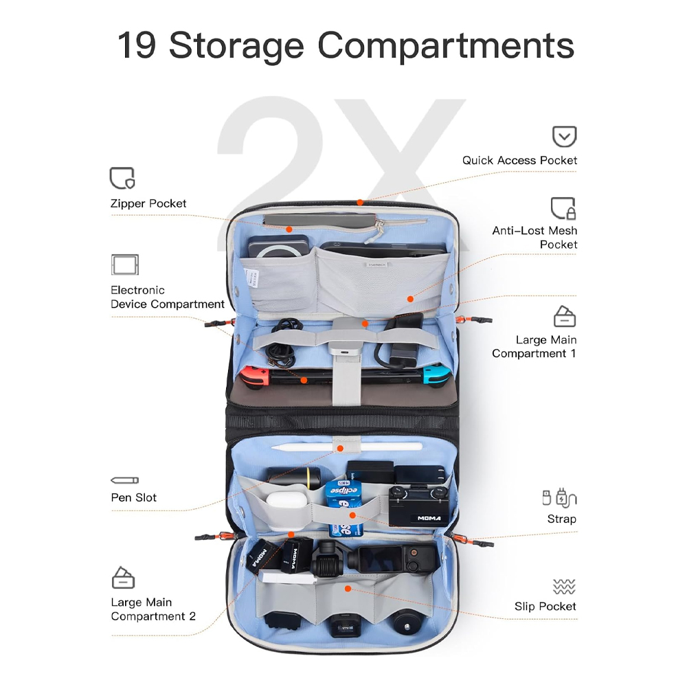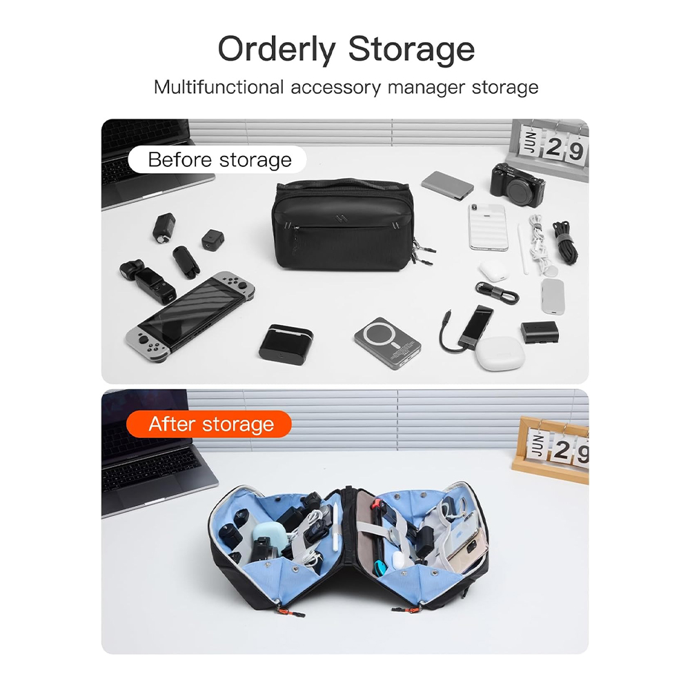 | 19 Kompartemen Barang Dilengkapi total 19 ruang penyimpanan, tas travel organizer mampu menampung berbagai perangkat dan aksesori seperti power bank, charger, kabel, earphone, mouse, kamera kecil, hingga konsol gaming portable. Tersedia kompartemen besar, kantong mesh anti-hilang, slot pena, saku slip, dan ruang elektronik khusus untuk menjaga setiap barang tetap pada tempatnya. |