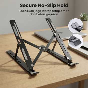 | Rangka Stabil dan Kokoh Rangka aluminium yang kuat, kokoh dan stabil dengan adanya pad silikon untuk mencegah laptop jatuh atau tergelincir. |