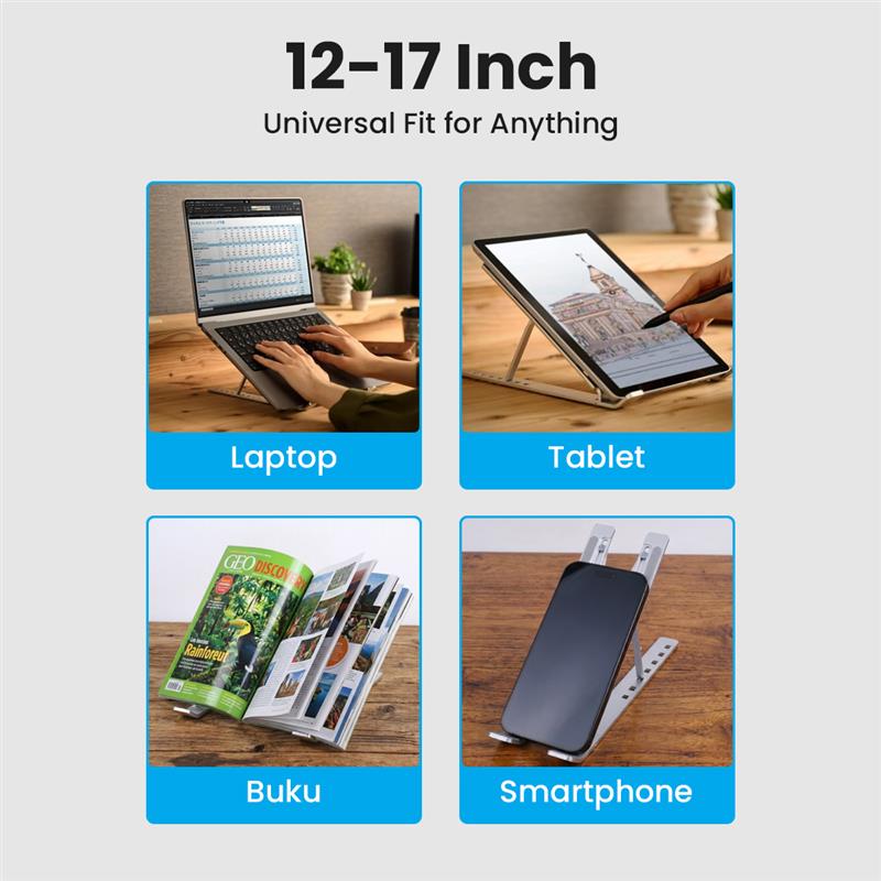 | Ukuran Universal untuk Semua Laptop Hadir dengan ukuran 25 cm, laptop stand ini dapat digunakan untuk laptop mulai dari ukuran 12 hingga 17 Inch. |