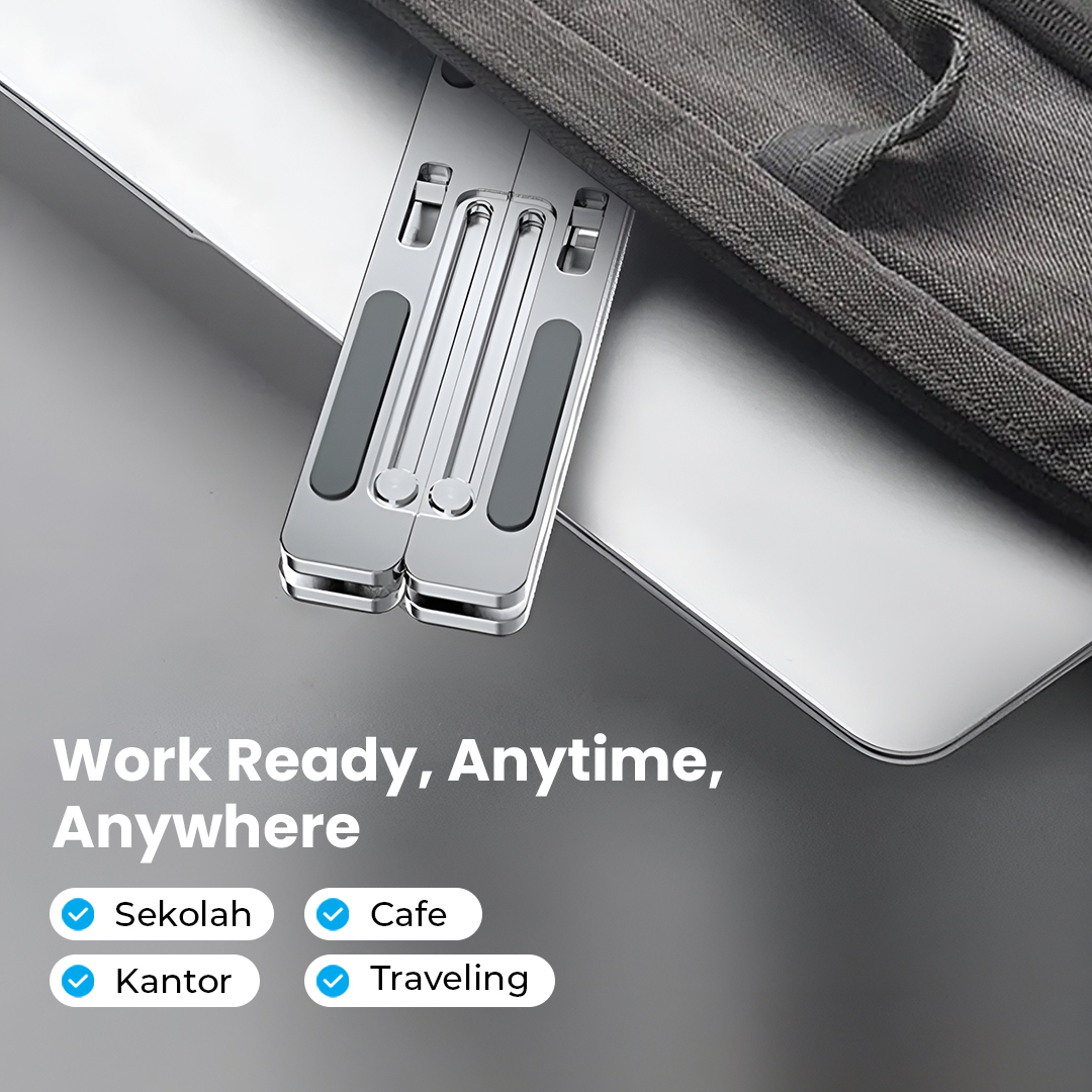 | Bawa dan Gunakan Kapan Saja Model lipat yang ringkas membuat laptop stand jadi perlengkapan kerja yang wajib dibawa saat WFA atau WFC. |