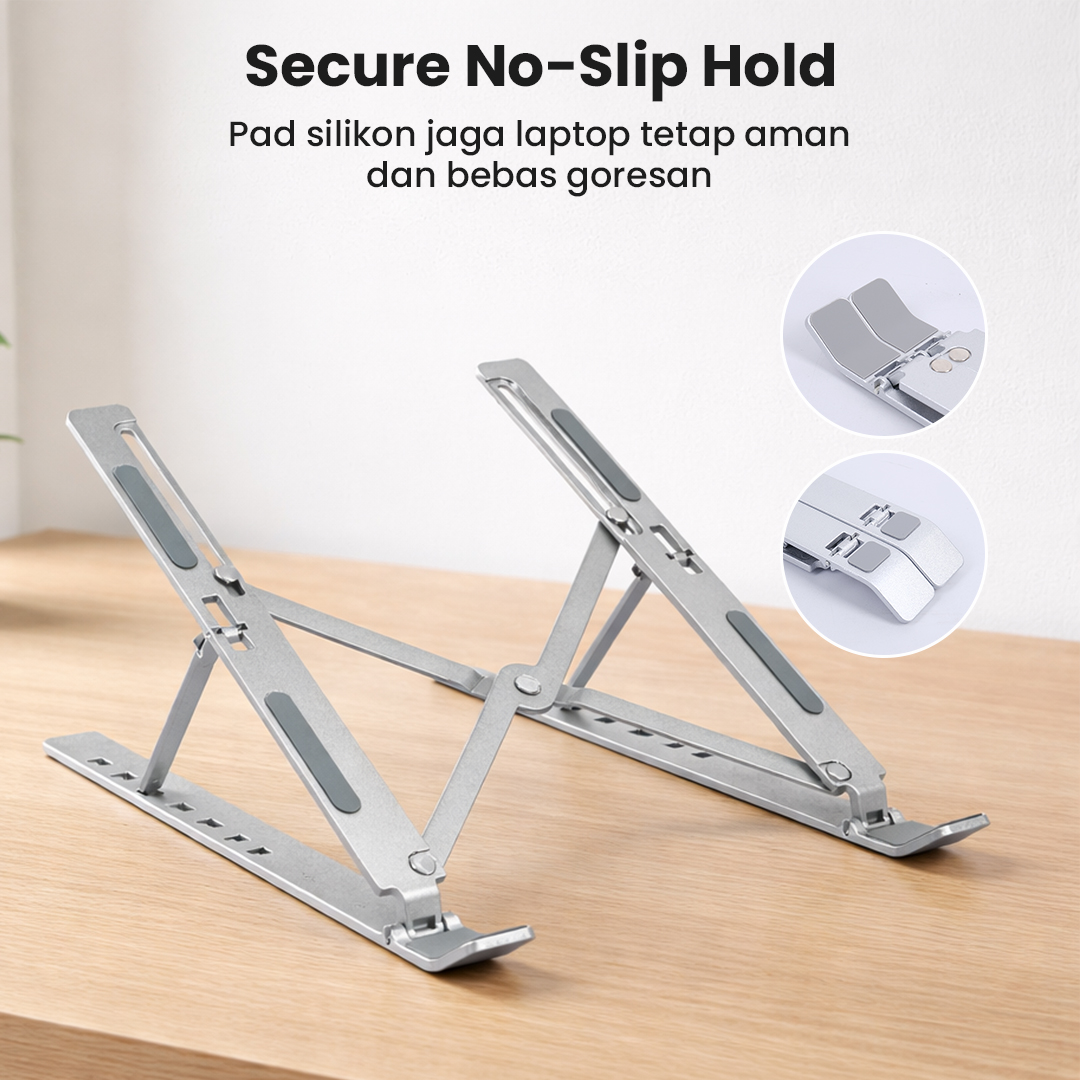 | Rangka Stabil dan Kokoh Rangka aluminium yang kuat, kokoh dan stabil dengan adanya pad silikon untuk mencegah laptop jatuh atau tergelincir. |