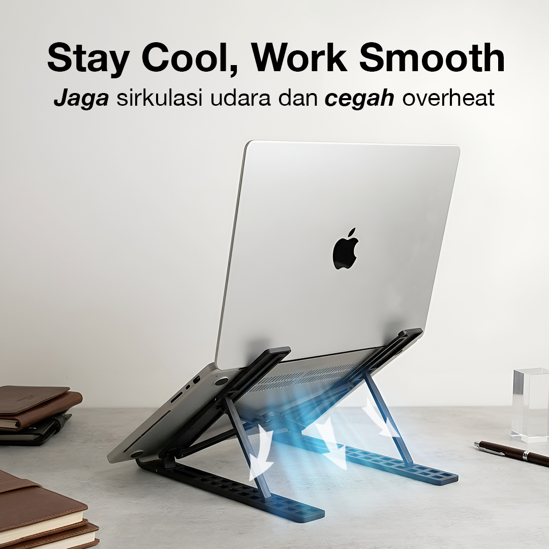 | Kerja Lancar Bebas Overheat Lubang ventilasi di bagian alas laptop stand pastikan sirkulasi udara tetap terjaga. Anda pun bisa menggunakan laptop dengan tenang tanpa khawatir lag karena overheat. |