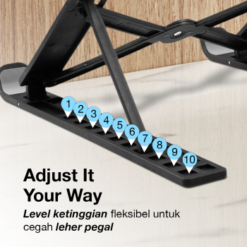 | Leher Bebas Pegal Menawarkan 10 level ketinggian, Anda dapat mengatur posisi laptop sesuai kebutuhan. Kini Anda bisa bekerja dengan nyaman tanpa khawatir leher pegal atau kaku meski dalam waktu yang panjang. |