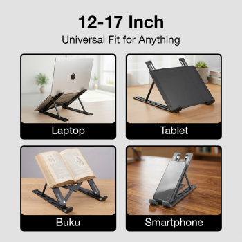 | Ukuran Universal untuk Semua Menawarkan ukuran universal, gunakan stand laptop untuk meletakkan berbagai barang. Mulai dari smartphone, tablet, buku, hingga laptop 17 Inch, semua bisa Anda letakkan di atas stand ini. |
