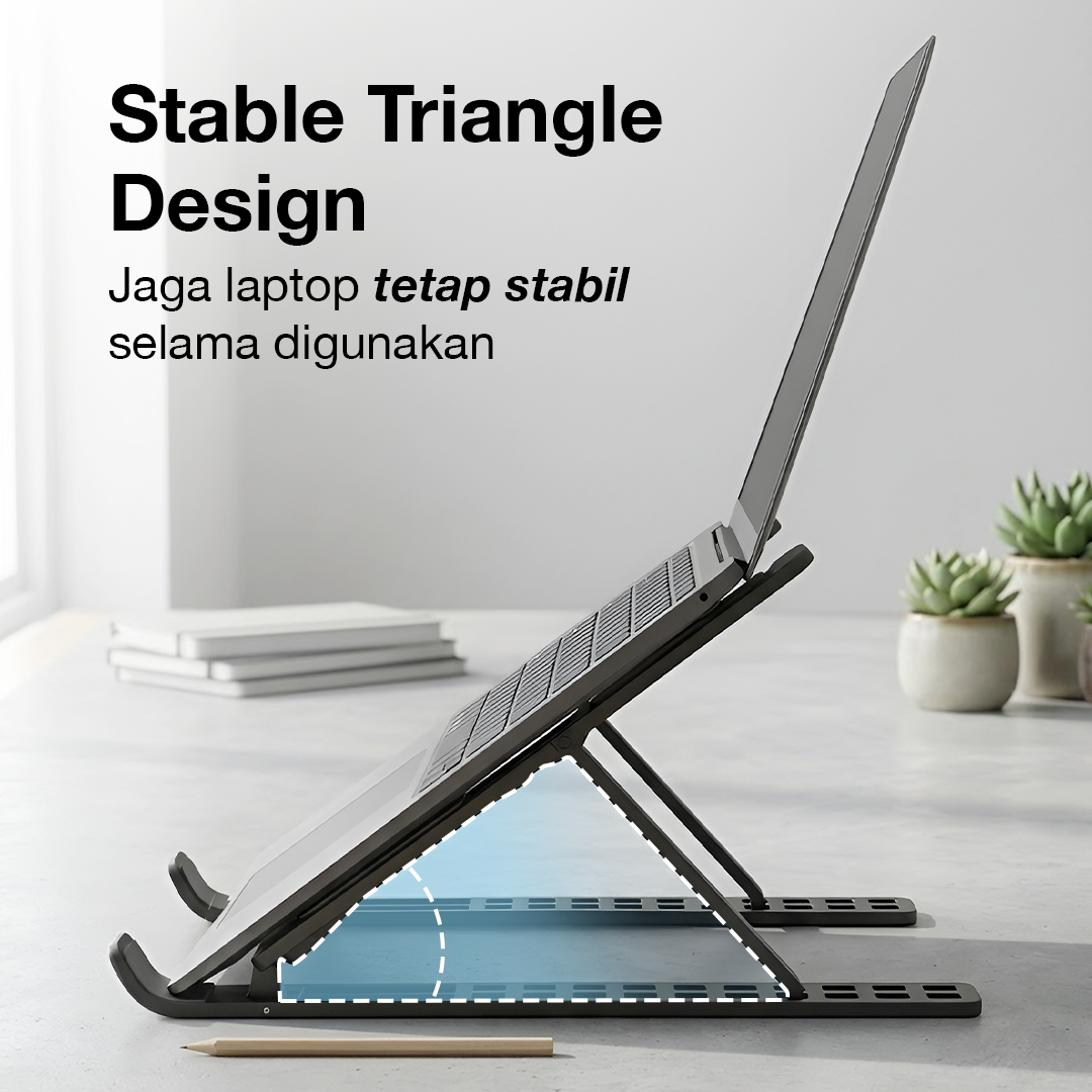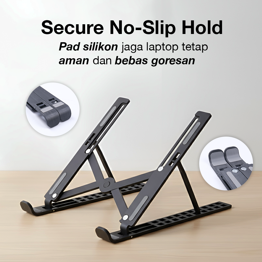 | Desain Ergonomis dan Stabil Desain ergonomis dengan kemiringan yang pas dan pad silikon anti slip dapat menopang laptop dengan maksimal. Ini yang memastikan stand laptop tetap stabil selama digunakan. |