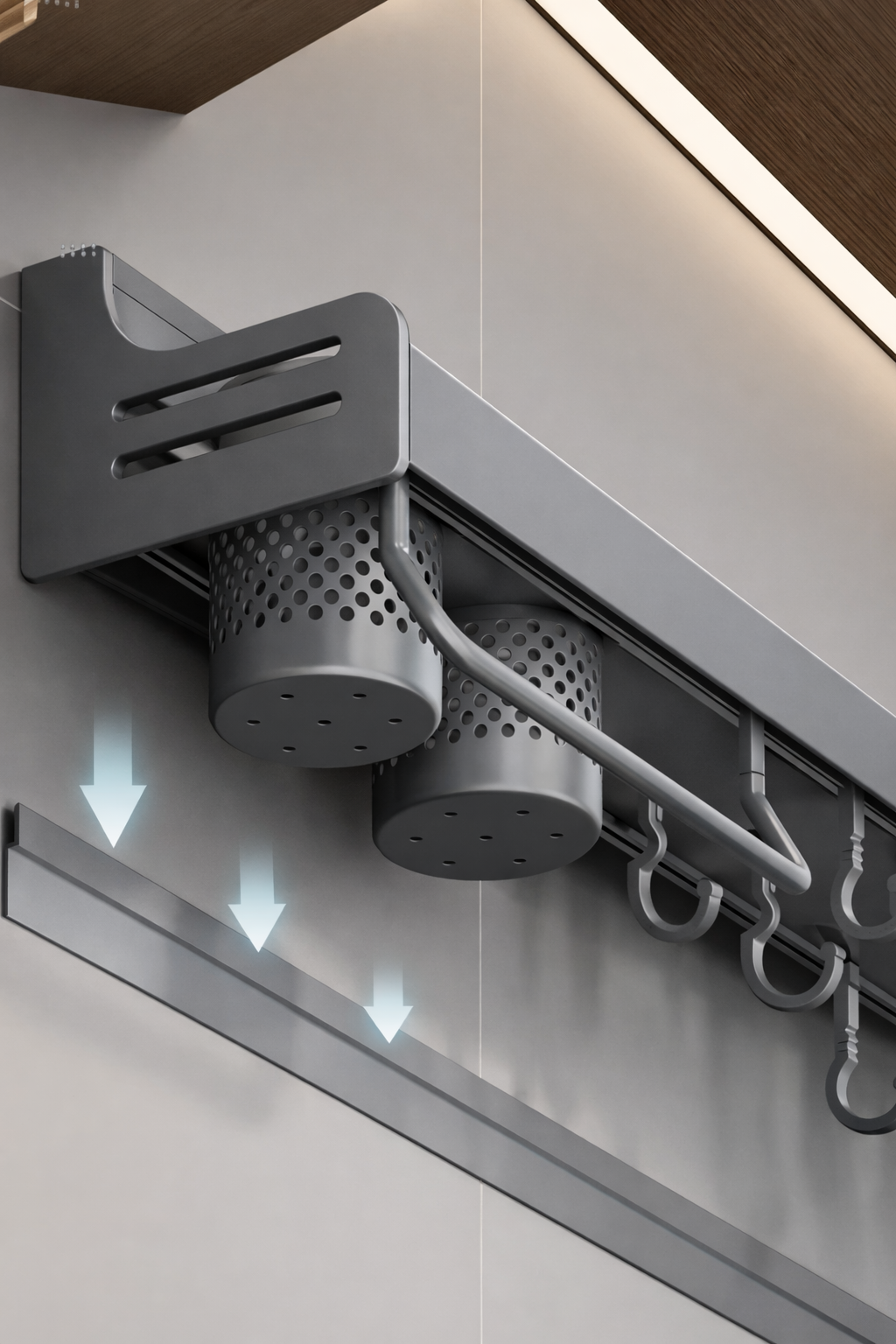 | 4 Hook Gantungan Multifungsi Rak ini memiliki 4 hook kuat yang dapat digunakan untuk menggantung spatula, sutil, sendok sayur, atau alat masak lainnya. Terdapat gantungan tambahan khusus untuk lap dapur, sehingga lebih higienis dan cepat kering. Semua perlengkapan dapur dapat diakses dengan cepat saat memasak. |