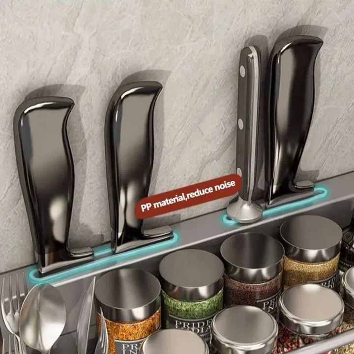| Penyimpanan Lengkap dan Terorganisir Rak utama berkapasitas luas memungkinkan Anda menyimpan beberapa botol bumbu dapur dengan rapi dan mudah dijangkau. Dilengkapi 4 slot pisau khusus untuk menjaga pisau tetap aman dan tertata. Tersedia juga cup serbaguna untuk sendok, garpu, dan sumpit agar tidak tercecer. |