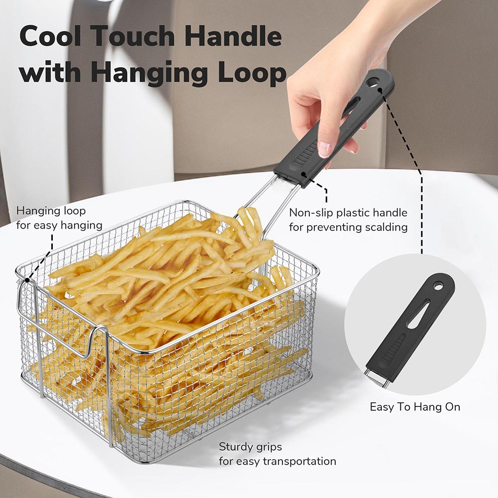 | Cara Mudah Pisahkan Minyak Struktur jaring halus dan rapat memudahkan proses penyaringan minyak setelah penggorengan. Minyak panas langsung mengalir turun secara optimal, sehingga minyak berlebih cepat tiris tanpa perlu ditekan atau dipindahkan ke wadah lain. Penggorengan lebih merata ke seluruh permukaan makanan dengan keranjang saringan deep fryer. |