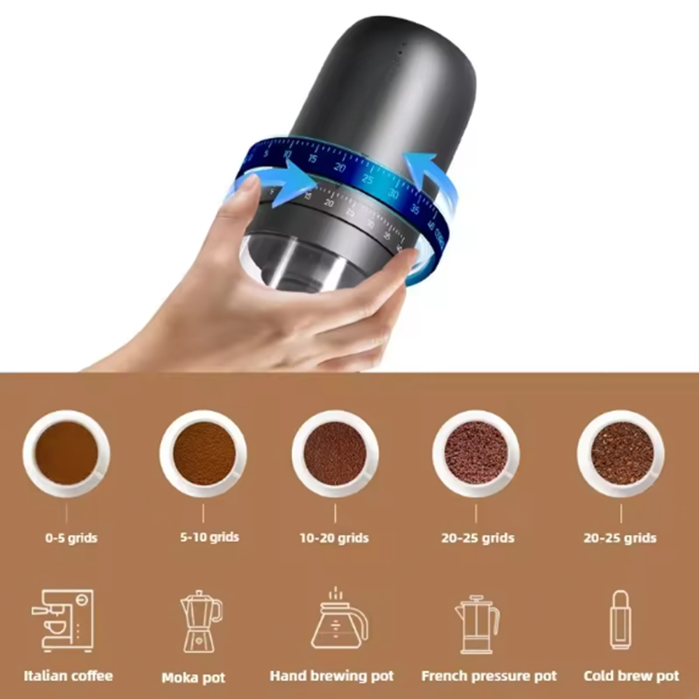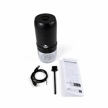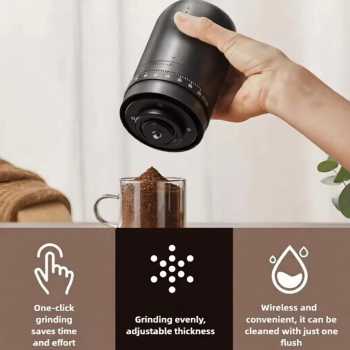 | Tanpa Kabel Melilit Dibekali baterai isi ulang berkapasitas 1800 mAh sehingga penggiling kopi ini dapat digunakan tanpa sambungan kabel daya. Saat dayanya habis, Anda bisa mengisi ulang dayanya menggunakan kabel USB Type C yang tersedia. |