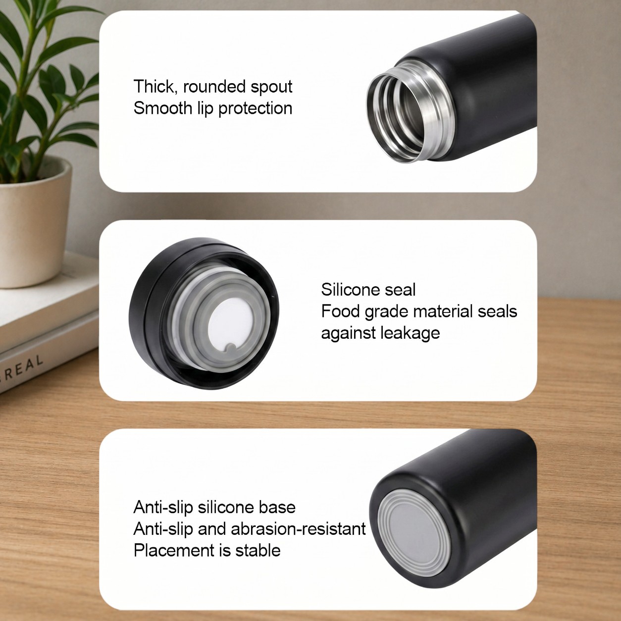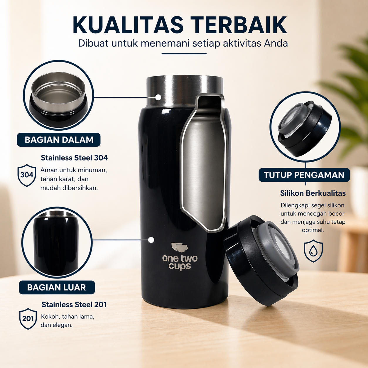 | Material Kualitas Terbaik Bagian dalam botol minum tumbler menggunakan stainless steel 304 yang aman untuk minuman panas maupun dingin, tidak mudah berkarat, tidak meninggalkan bau atau rasa, serta tahan terhadap asam dan suhu tinggi. Sementara itu, bagian luar menggunakan stainless steel 201 berfungsi sebagai lapisan pelindung yang kuat dan kokoh, membuat bodi cup lebih tahan benturan dan awet. |