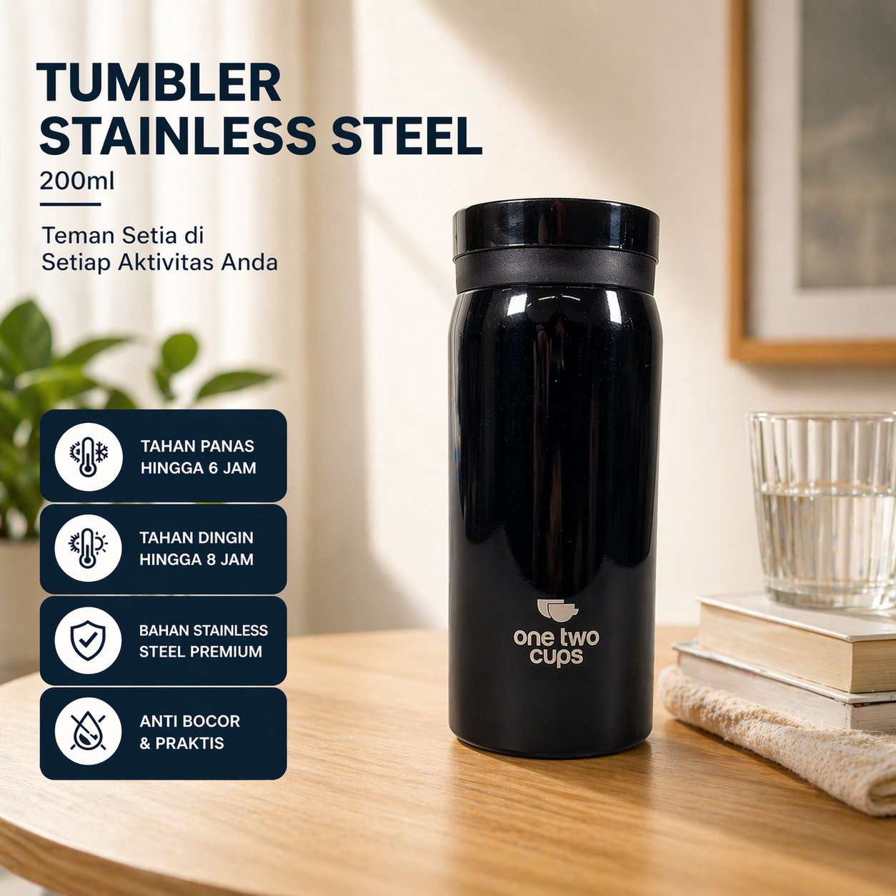 Nikmati minuman favorit Anda dengan cara yang lebih praktis dan stylish menggunakan botol minum tumbler dari One Two Cups. Bagian dalamnya menggunakan material stainless steel 304 dan bagian luarnya stainless steel 201 yang mampu menjaga suhu lebih tahan lama. Memiliki tutup anti tumpah sehingga aman dibawa dan disimpan di dalam tas tanpa khawatir air bocor.