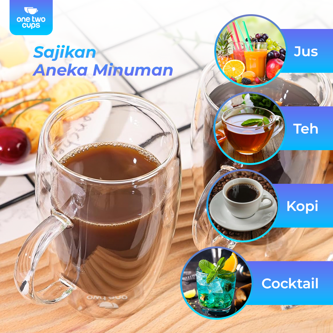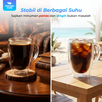 Buat tampilan minuman Anda lebih estetik dengan cangkir kaca dari One Two Cups. Desain minimalis dengan model double wall membuat cangkir lebih nyaman saat dipegang. Terbuat dari kaca borosilikat dengan ketahanan suhu tinggi, kini Anda bisa menggunakan cangkir kaca untuk menyajikan minuman ala cafe di rumah.