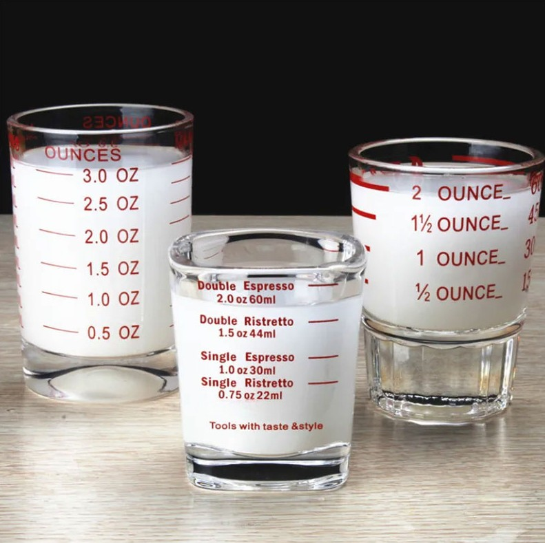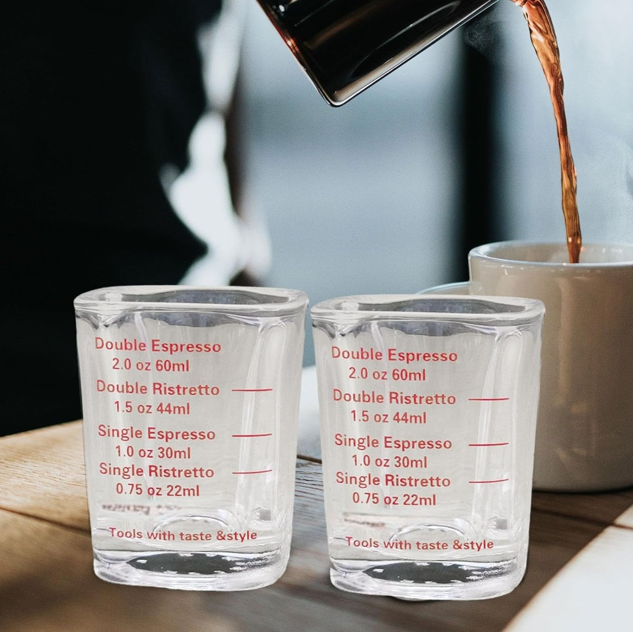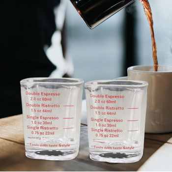 | Model Kotak Ergonomis Kini menuang espresso jadi lebih mudah berkat desain kotak pada gelas takar kopi ini. Sudutnya berfungsi seperti corong atau spout sehingga gelas takar membantu mencegah tumpahan saat proses penuangan. |