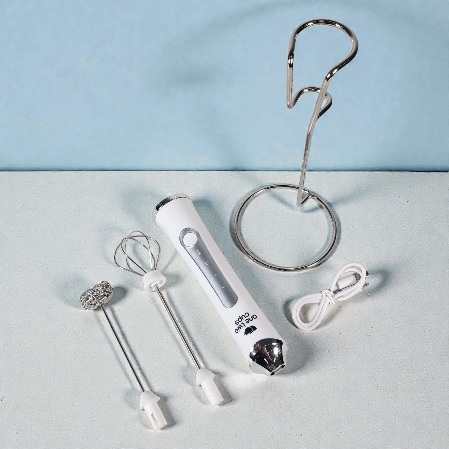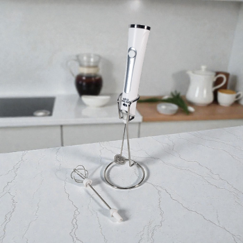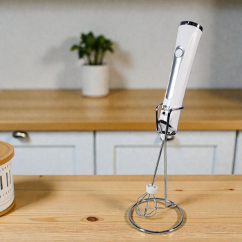 Milk frother elektrik genggam dengan 3 level kecepatan (4500-8000 RPM), desain ringan dan bracket penyangga. Multifungsi untuk foam kopi, telur, krim, dan minuman lainnya. Praktis, presisi, dan cocok untuk dapur modern.
